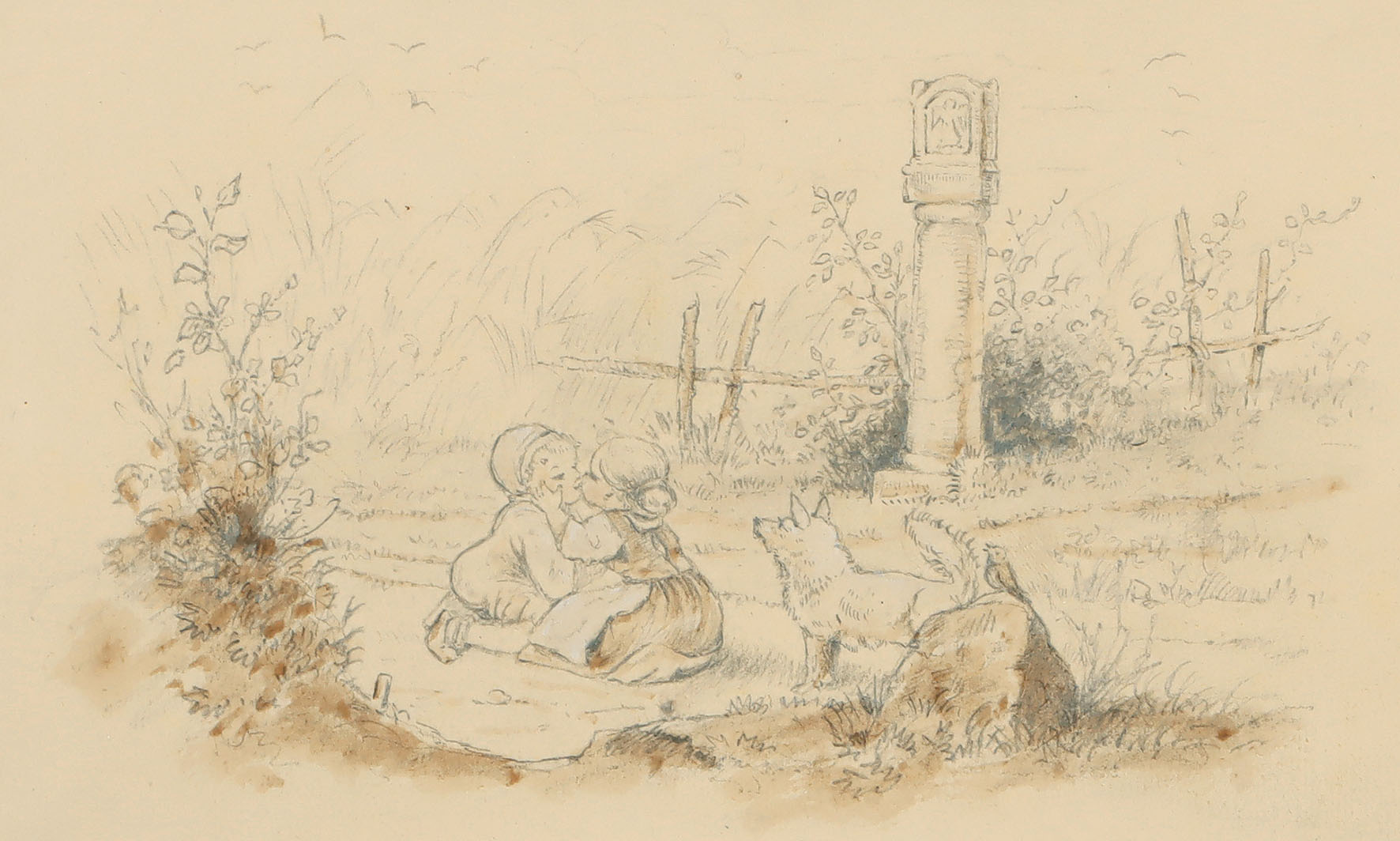 Wiese mit zwei sich küssenden Kindern und einem Hund. Stellenweise in Deckweiß gehöhte und in Braun lavierte Bleistiftzeichnung.
