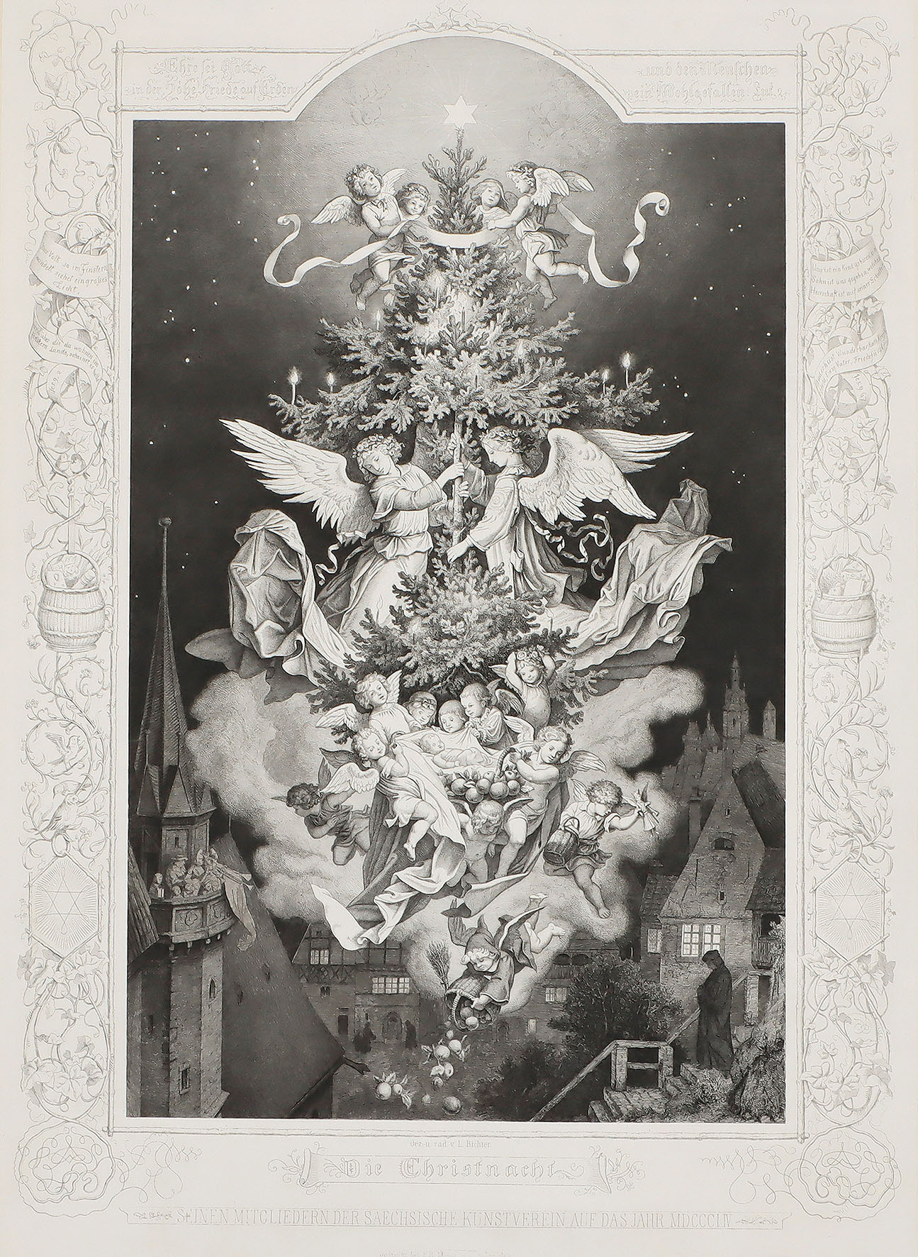 Genoveva – Die Christnacht. 2 Bll. Radierungen (davon Bl. 2 mit floraler und figürlicher Bordüre) um 1848/55