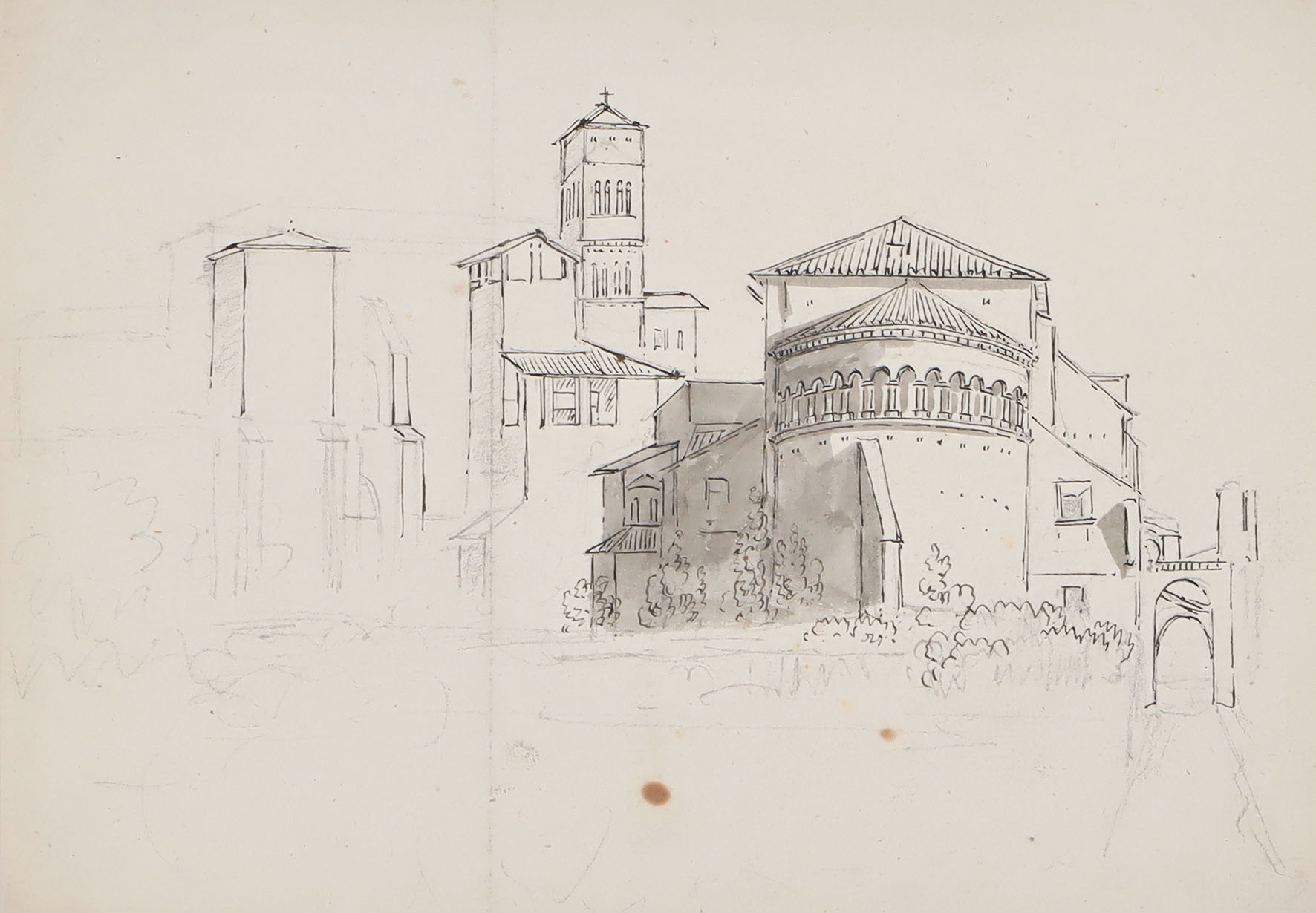 Grottaferrata in den Albaner Bergen. Blick auf Teile der Stadt mit Kirche. Lavierte Tuschfederzeichnung mit Bleistiftskizze aus einem Skizzenbuch.