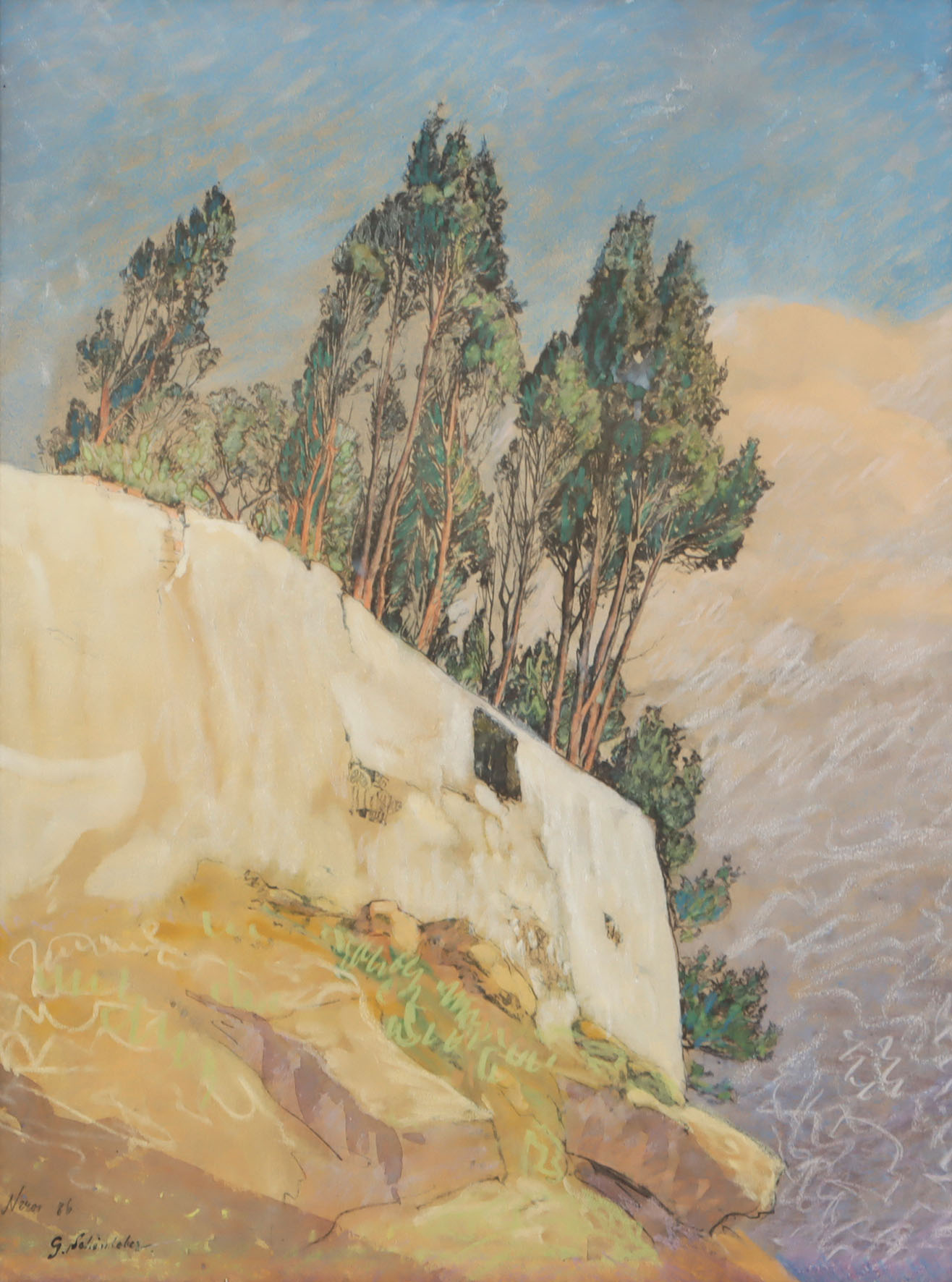 Signiert, datiert und ortsbezeichnet. Auf chamoisfarbenem Vélin. 39,5 x 29 cm. Schwach gebräunt und angestaubt. Ränder hinterklebt. „Im März 1886 fuhr Schönleber mit der inzwischen angewachsenen Familie nach Genua und Nervi, wo sie Ausflüge unternahmen. Bei frühlingshaftem Wetter entstanden zahlreiche Felsstudien und Küstenbilder“ (a.o.O., S. 35). [bg]