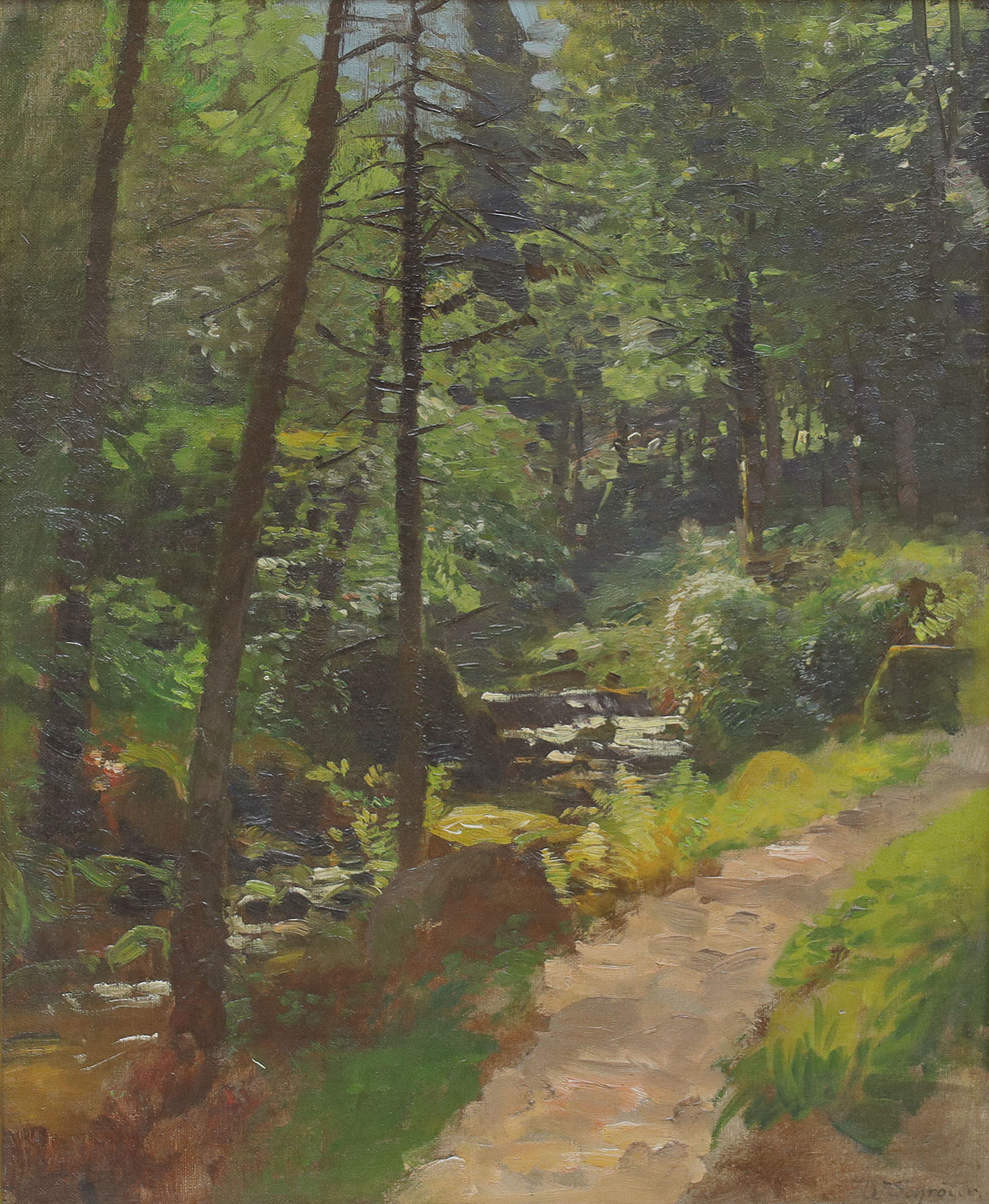 Waldinneres mit einem Bachlauf. Oel auf auf Leinwand, auf Karton aufgezogen.