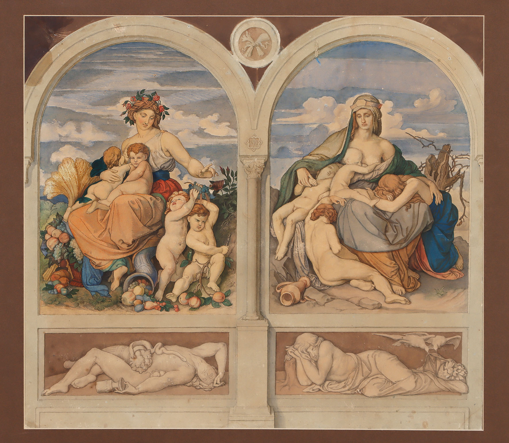 Herbst und Winter. Allegorische Darstellungen der beiden Jahreszeiten, durch eine Säule getrennt und mit Rundbogenabschluss, darunter zwei weitere Darstellungen mit schlafender Frau. Aquarell mit Federzeichnung in Grau.
