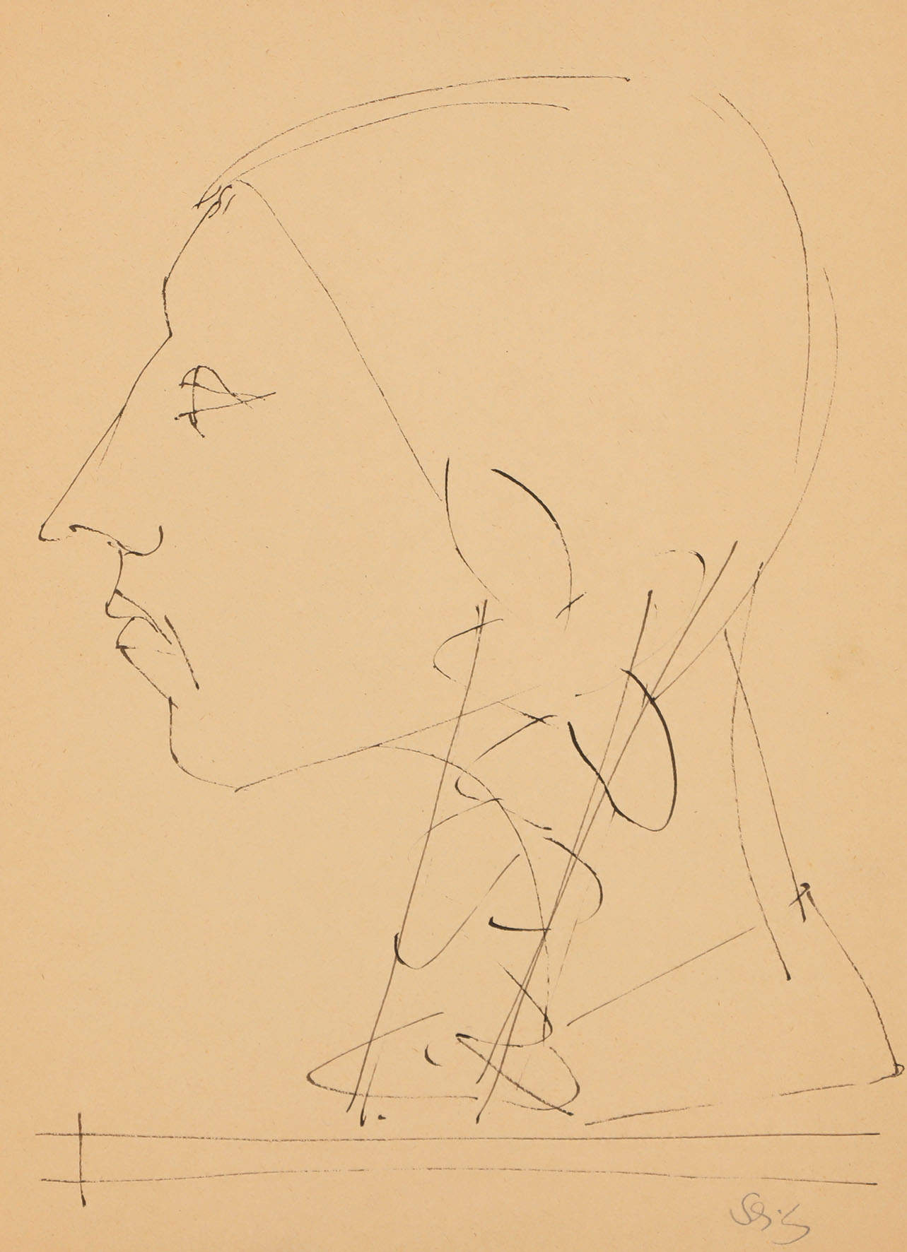 Mädchenkopf im Profil nach links. Federzeichnung in Schwarzbraun.