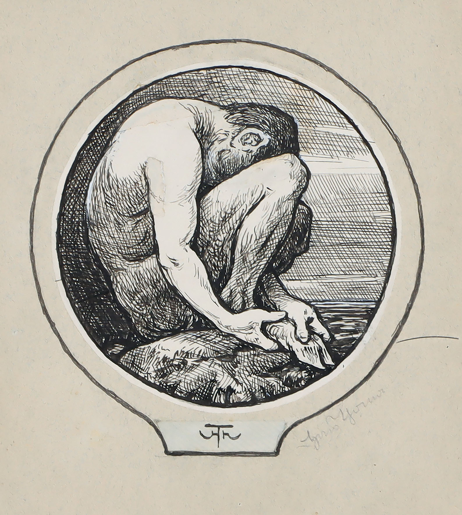 Einsamkeit. Kauernder Faun auf einer Felsklippe. Darstellung im Rund. Illustrationsvorlage für das Schlußstück auf Seite 29 von „Federspiele“. Tuschfederzeichnung mit stellenweisen Deckweißretuschen, appliziert auf kräftigem graugrünem Vélin mit zweifacher Tuschfederumrahmung, um 1892.