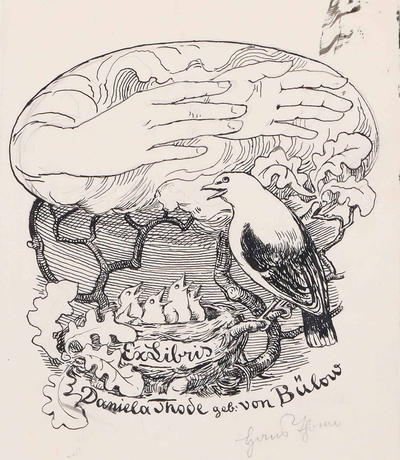 Exlibris Daniela Thode, geb. von Bülow. Schützende Hände über einem Vogelnest. Vorzeichnung für das ExLibris von Daniela, Tochter von Cosima Wagner, geschiedene von Bülow und dem Dirigenten Hans von Bülow, Gattin des Kunsthistorikers Henry Thode. Tuschfederzeichnung um 1902.