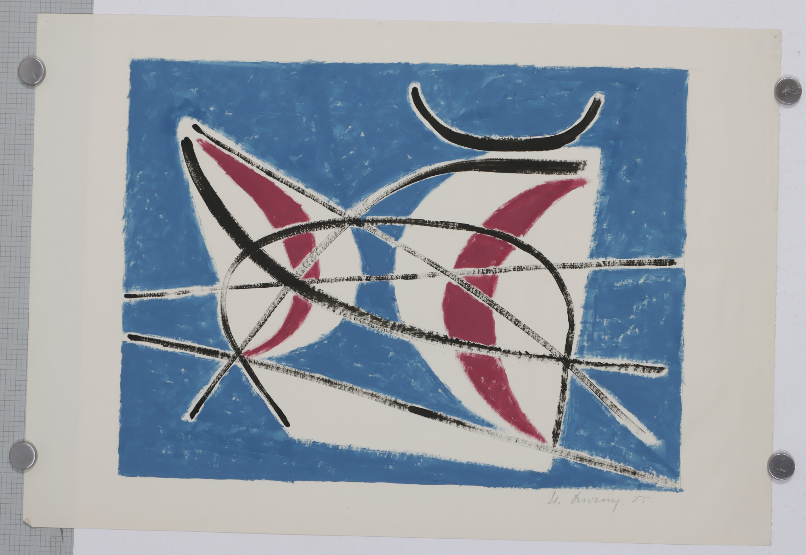 Abstrakte Komposition mit Blau, Schwarz und Himbeerrot. Gouache 1955.