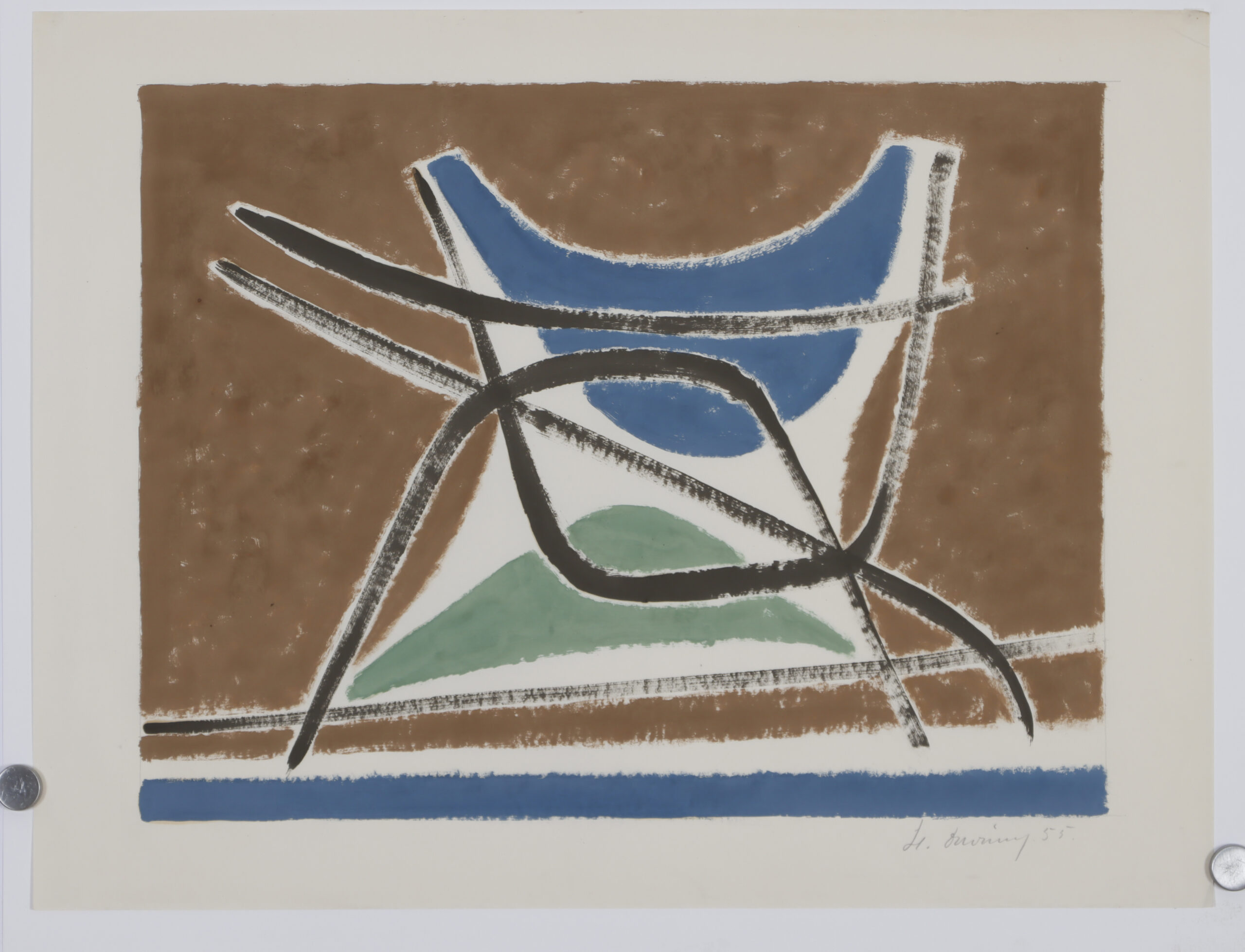 Abstrakte Komposition mit Ocker, Blau und Grün. Gouache mit Einfassungslinie in Bleistift 1955.