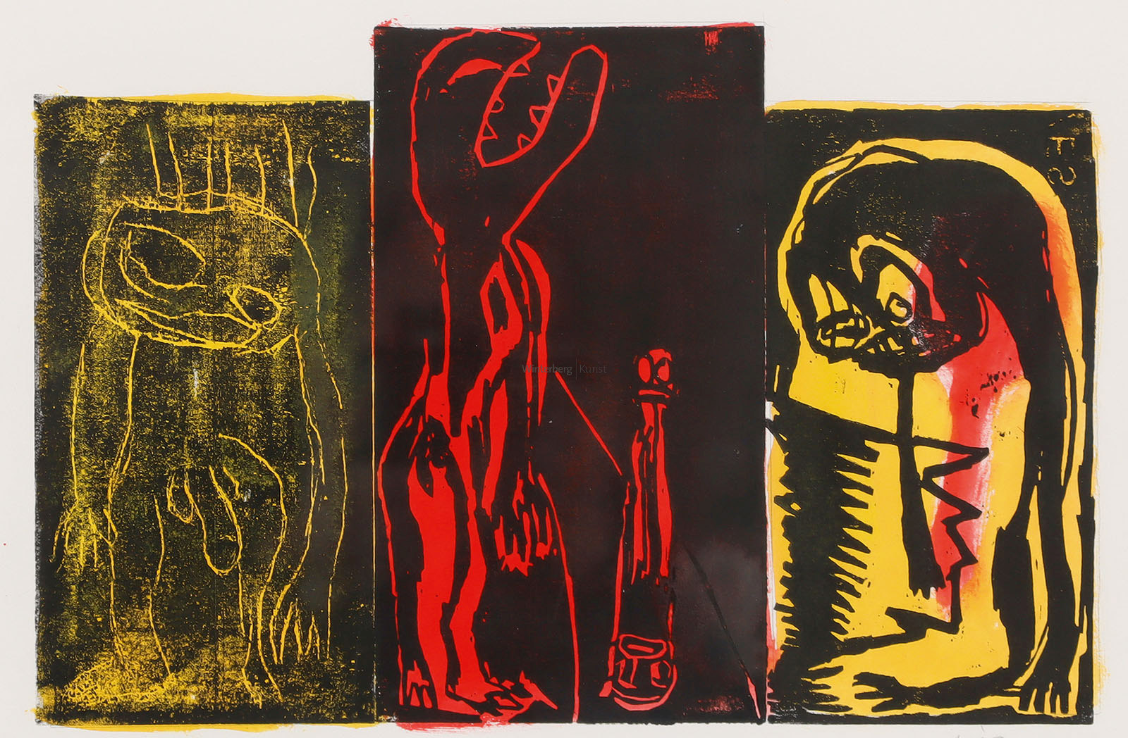 Mit appliziertem typographischen Namenszug sowie unterhalb der Darstellung mit handschriftlichem Text „Oft wird es so gemacht“ und in der linken unteren Blattecke mit „Kopf für Kukirol / Akne . Salbe“ bezeichnet. Am linken Darstellungsrand kaum sichtbare Bleistiftnotizen. Auf chamoisfarbenem Vélin, mit kleiner Eckfehlstelle und -knickspur (links oben) und Einriss (am breiten Unterrand) auf Karton aufgezogen. 37,5 x 28,2 cm (Blatt). Leicht unfrisch und untere Hälfte im Randbereich leicht fleckig. Provenienz: Nachlass des Künstlers. [ms]