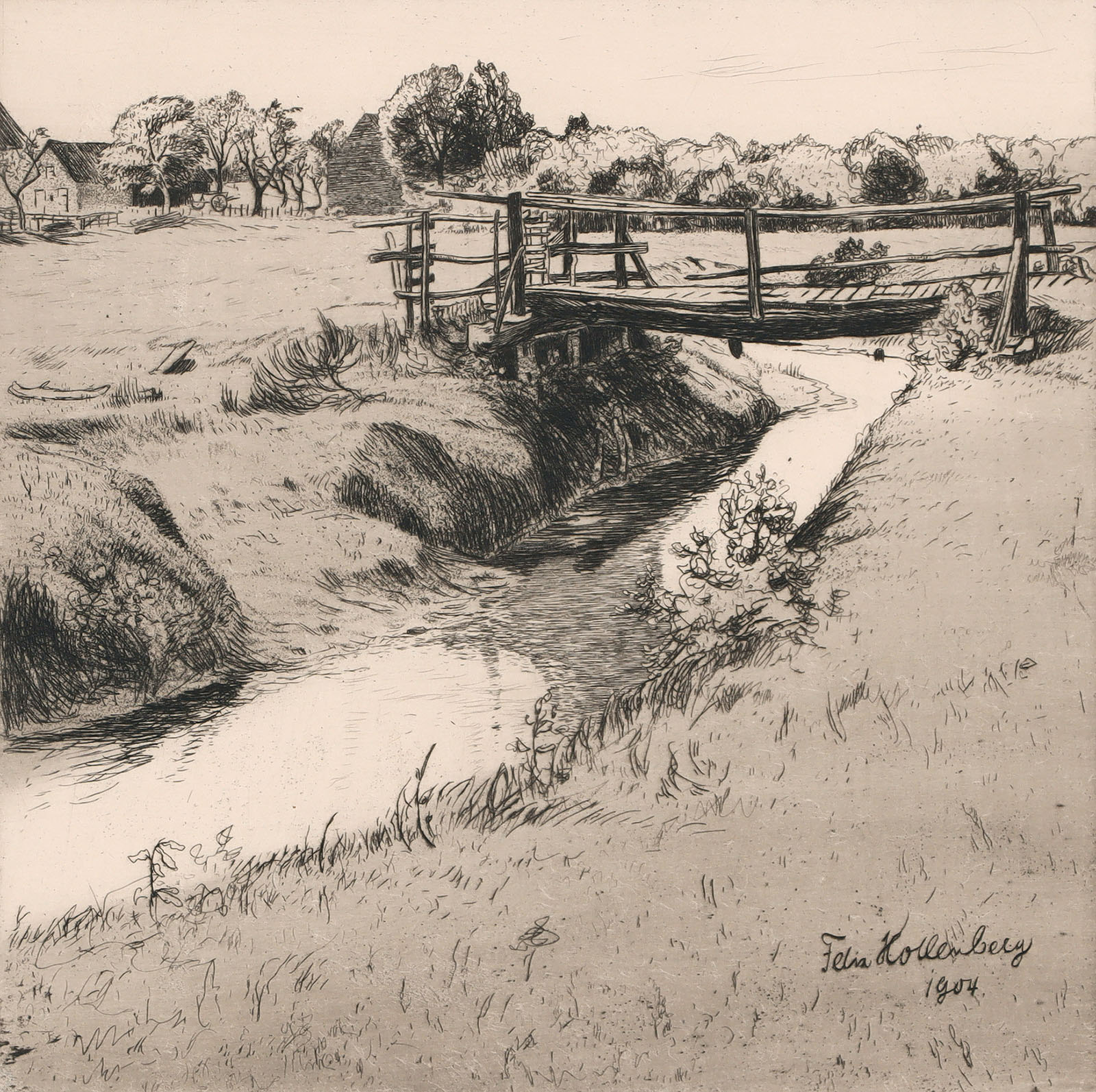 Kleinstadthäuser mit Brücke. Bleistiftzeichnung mit Resten von Einfassungslinie, um 1910.