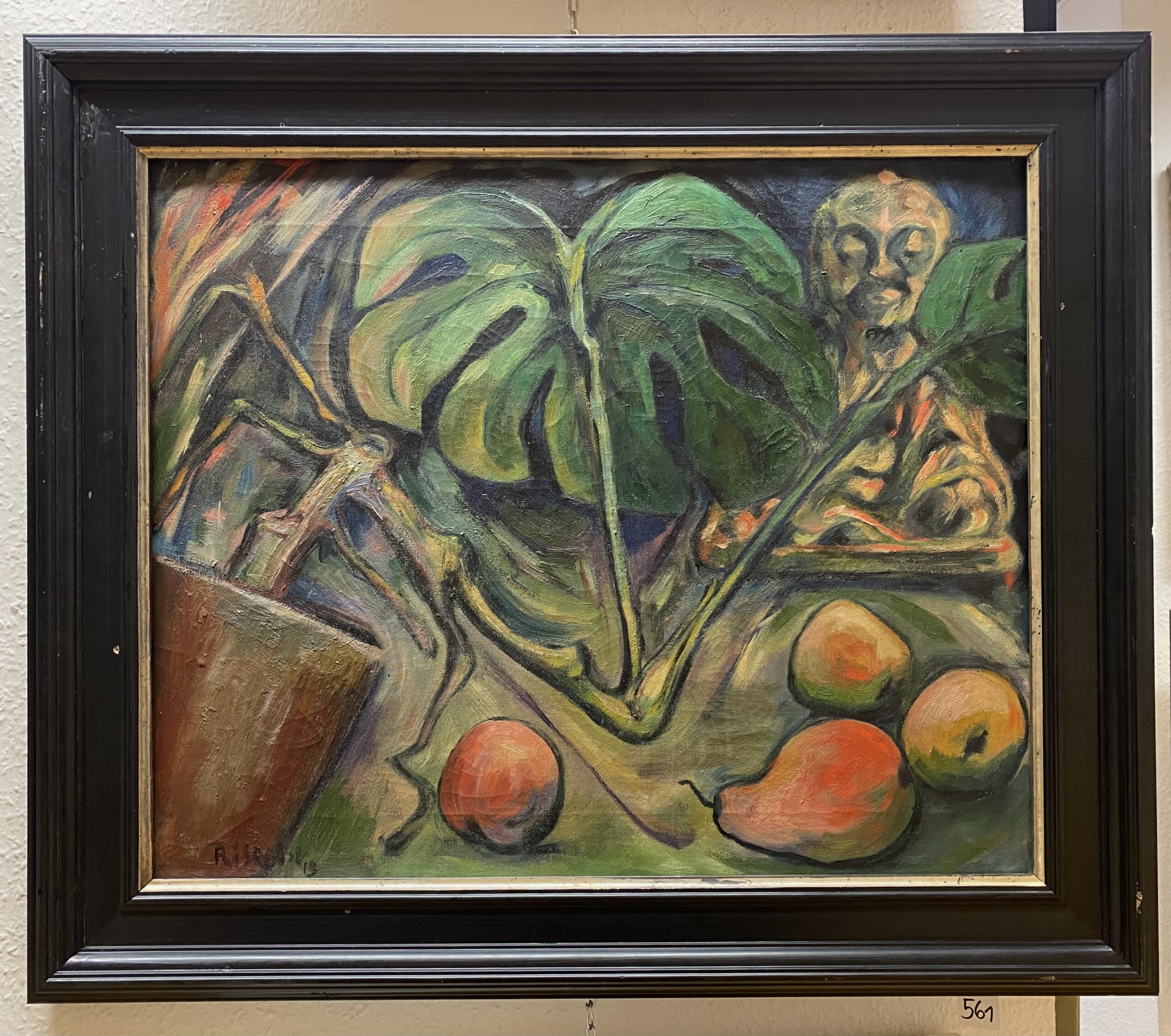 Signiert und datiert. Verso monogrammiert „Rt“, datiert „Dez 19“ und teils unleserlich betitelt. 45 x 55 cm. Mit feinen Krakelüren. Ritschl lebte ab 1908 in Wiesbaden, wo er bis 1919 bei der Landesbank arbeitete. Gleichzeitig hatte er erste Erfolge als Schriftsteller und Bühnenautor. Unter dem Eindruck des Endes des I. Weltkrieges unternahm er erste autodidaktische Malversuche. Ab 1919 konzentrierte er sich ganz auf die Malerei und war als freischaffender Künstler tätig. Bereits im gleichen Jahr wurden seine Bilder erstmals im Nassauischen Kunstverein in den Räumen des Museums Wiesbaden ausgestellt. Die Ausstellung war äußerst erfolgreich, er konnte fast alle Werke verkaufen. Dies bestärkte ihn in seinem Entschluss, sich ganz auf die Malerei zu fokussieren. In Wiesbaden wurde Ritschl in den 1920er Jahren zu einem der wichtigsten Netzwerker der Avantgarde. 1920 besuchte er Conrad Felixmüller in Klotzsche, der zu dieser Zeit über den Sammler Heinrich Kirchhoff mit der Wiesbadener Künstlerszene in engem Austausch stand und ein Bildnis von Ritschl malte. Ab 1923 entwickelte sich eine Freundschaft mit Alexej von Jawlensky, der zwei Jahre zuvor in die Stadt gezogen war. Außerdem war er 1925 mit dem Gemälde „Der Betrunkene“ (Mirus 1924/9) auf der prägenden Ausstellung „Die Neue Sachlichkeit. Deutsche Malerei seit dem Expressionismus“ in Mannheim vertreten (Die Neue Sachlichkeit. Eine Jahrhundertausstellung. Ausst.-Kat. Kunsthalle Mannheim 2024/25, Kat.-Nr. 32 mit Farbabb. S. 68). 1926-30 reiste er mehrfach nach Paris, wo er Georges Braque, Pablo Picasso, Max Ernst u.a. begegnete. Nach dem vorzeitigen Abbruch der Essener Ausstellung „Zeichen und Bilder“ durch die Nationalsozialisten 1933 wurde Ritschl als „Entarteter Künstler“ diffamiert. Nach 1945 avancierte er aber zu einem bedeutenden abstrakten Maler des 20. Jahrhunderts in Deutschland. Das vorliegende Gemälde zeigt eine im Werkverzeichnis von Wolff Mirus – Schüler von Otto Ritschl und seit frühester Jugend mit ihm vertraut – nicht aufgeführte Arbeit. Unter den für das Jahr 1919 lediglich 9 genannten Werken findet sich kein ähnliches Motiv, so daß das frühe Stilleben mit Philodendron eine Ausnahmestellung einnimmt. Die Komposition zeigt in einem interessanten Blickwinkel eine hinter einem großen, aus einem Topf wuchernden Blatt fast versteckte Buddha-Statue. Die einzelnen Motive stellen Reminiszenzen an verschiedene Stilrichtungen dar: die Pflanze weist in nüchterner Auffassung auf eine deutliche Hinwendung zur Neuen Sachlichkeit hin, so wie die Statue auf das Interesse der Expressionisten an der Kunst und Kultur außereuropäischer Völker; auch die Früchte im Vordergrund erinnern an französische Stillleben in der Art von Cezanne. Wolff Mirus bestätigt in einer Mail vom 4. September 2025 die Authentizität des Gemäldes und bezeichnet es als „hübschen Volltreffer“ und „kleinen Schatz“. Auf Spannrahmen. [bg]