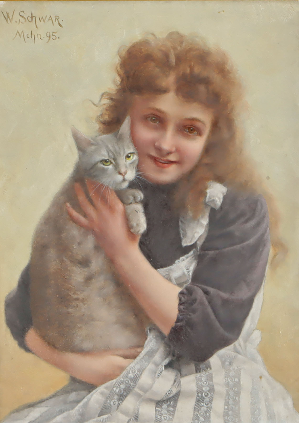 Signiert, datiert und ortsbezeichnet „Mchn.“. 16 x 12 cm. Zuerst autodidaktisch tätig, studierte Schwar ab 1885 in München und wurde Mitglied der „Münchner Künstlergenossenschaft“. Er bestückte zahlreiche Ausstellungen und war vor allem für seine Katzendarstellungen bekannt. Gerahmt. [bg]