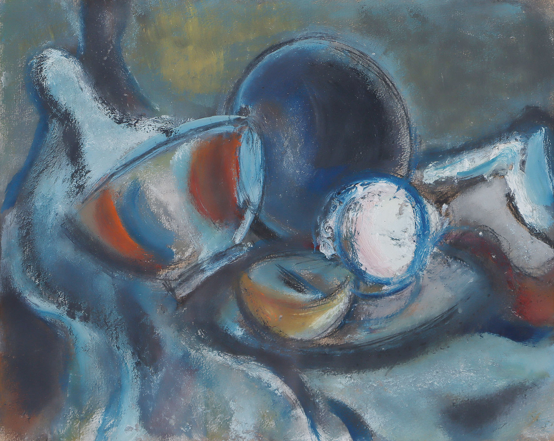 Stilleben mit Teller und Früchten. Oel auf Leinwand.