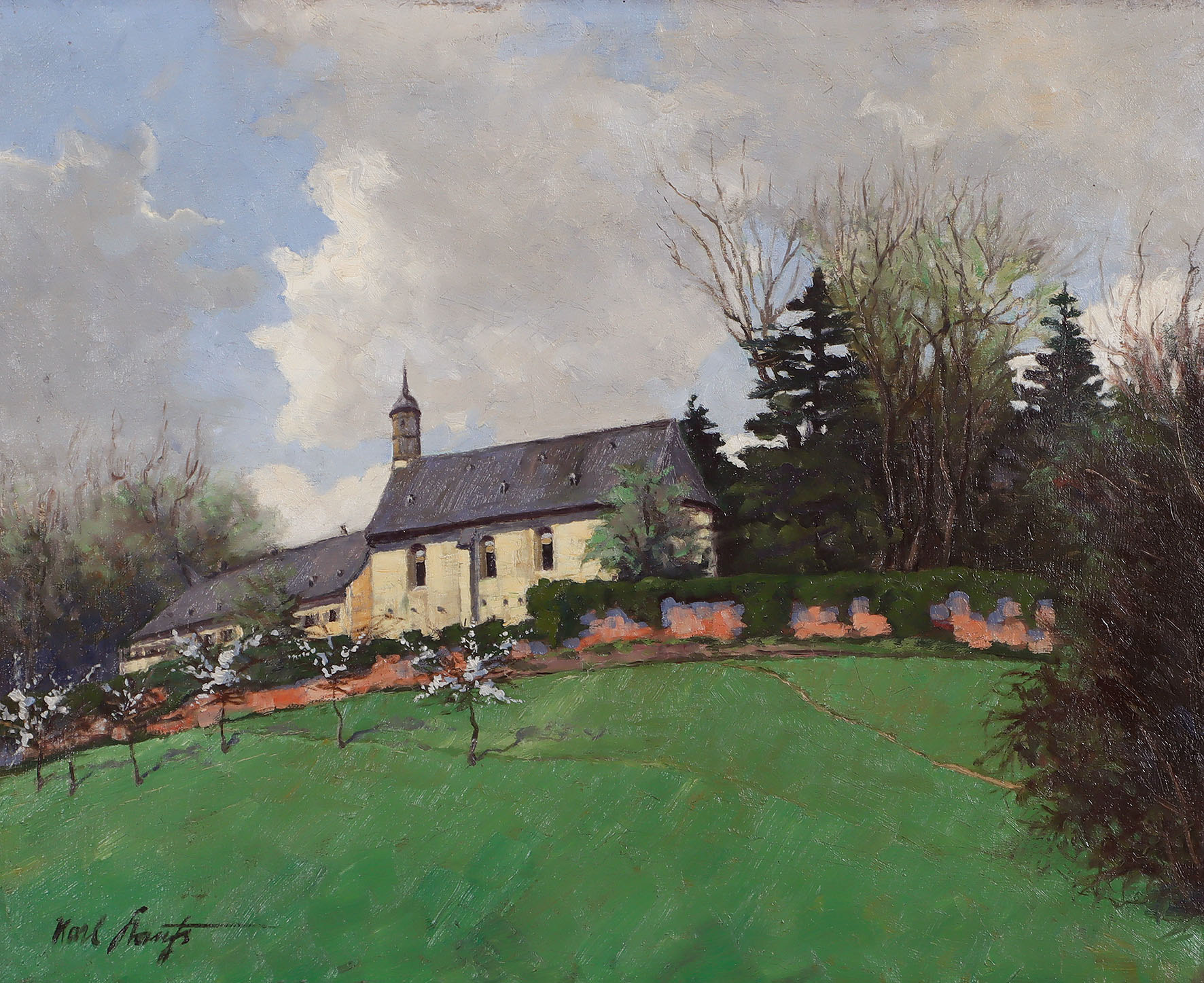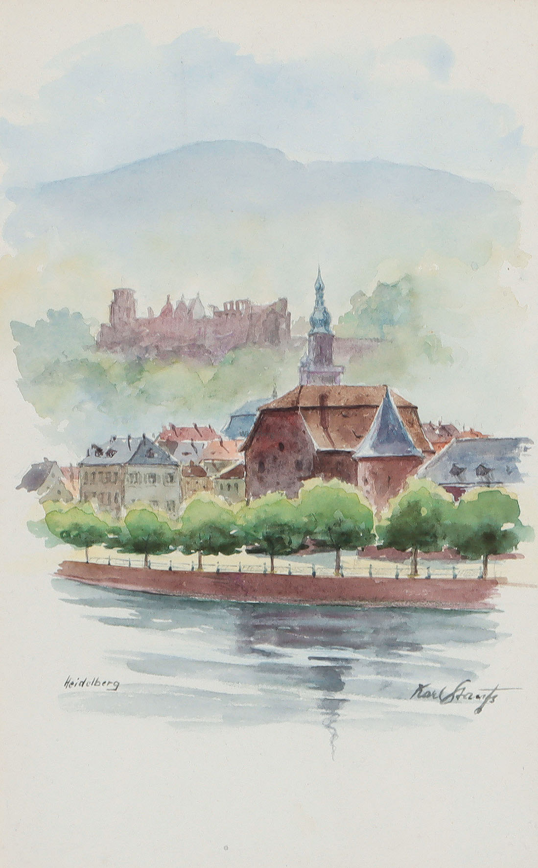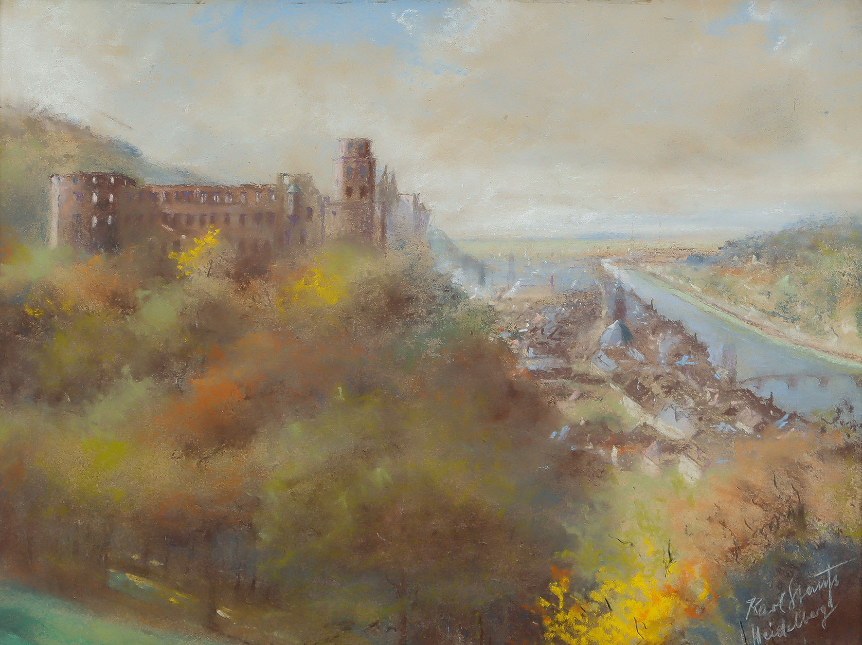 Signiert. Verso signiert, datiert und ortsbezeichnet „Stift Neuburg / Heidelberg“ sowie auf dem Spannrahmen mehrfach von fremder Hand bezeichnet. 50,5 x 62 cm. Mit Nadelspuren an den Rändern. Der Künstler Karl Stauss ist bekannt für seine detailliert und stimmungsvoll ausgeführten Motive aus seiner Heimatstadt Heidelberg und deren Umgebung, häufig als Pastell und Aquarell, aber auch in Oel. Gerahmt. [bg]