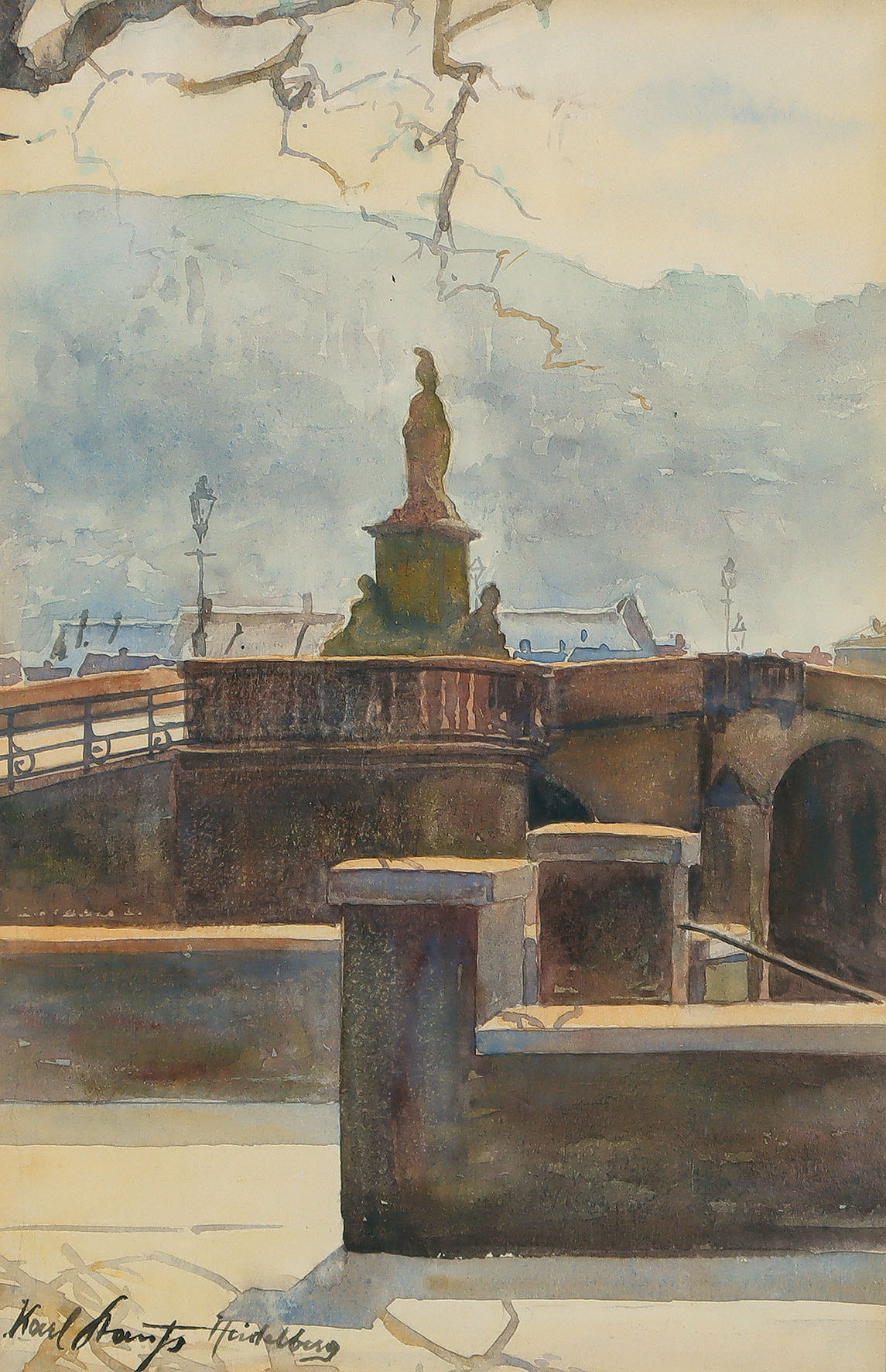 Heidelberg: Blick vom nördlichen Neckarufer auf Teile der Alten Brücke mit der Minervastatue, dahinter der Königstuhl im Dunst. Aquarell.