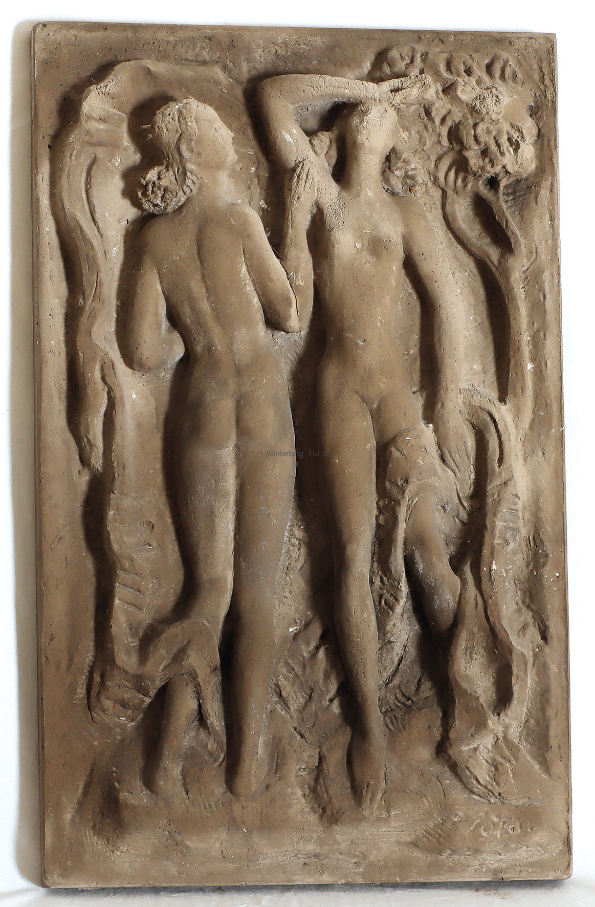Zwei weibliche Akte mit Tüchern. Steinrelief in Graubraun mit Wandaufhängung.