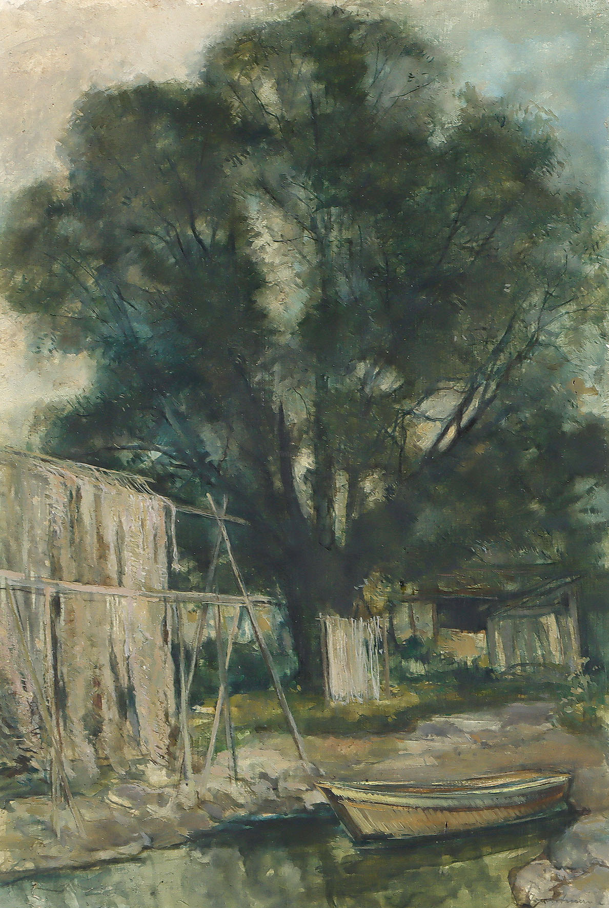 Baum an einem Gewässer mit Kahn und trocknenden Fischernetzen. Oel auf Holz.