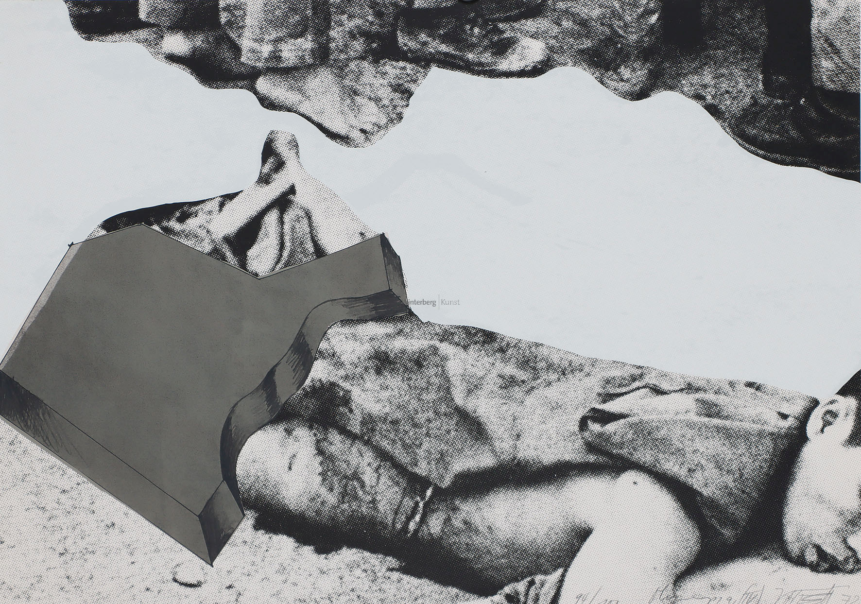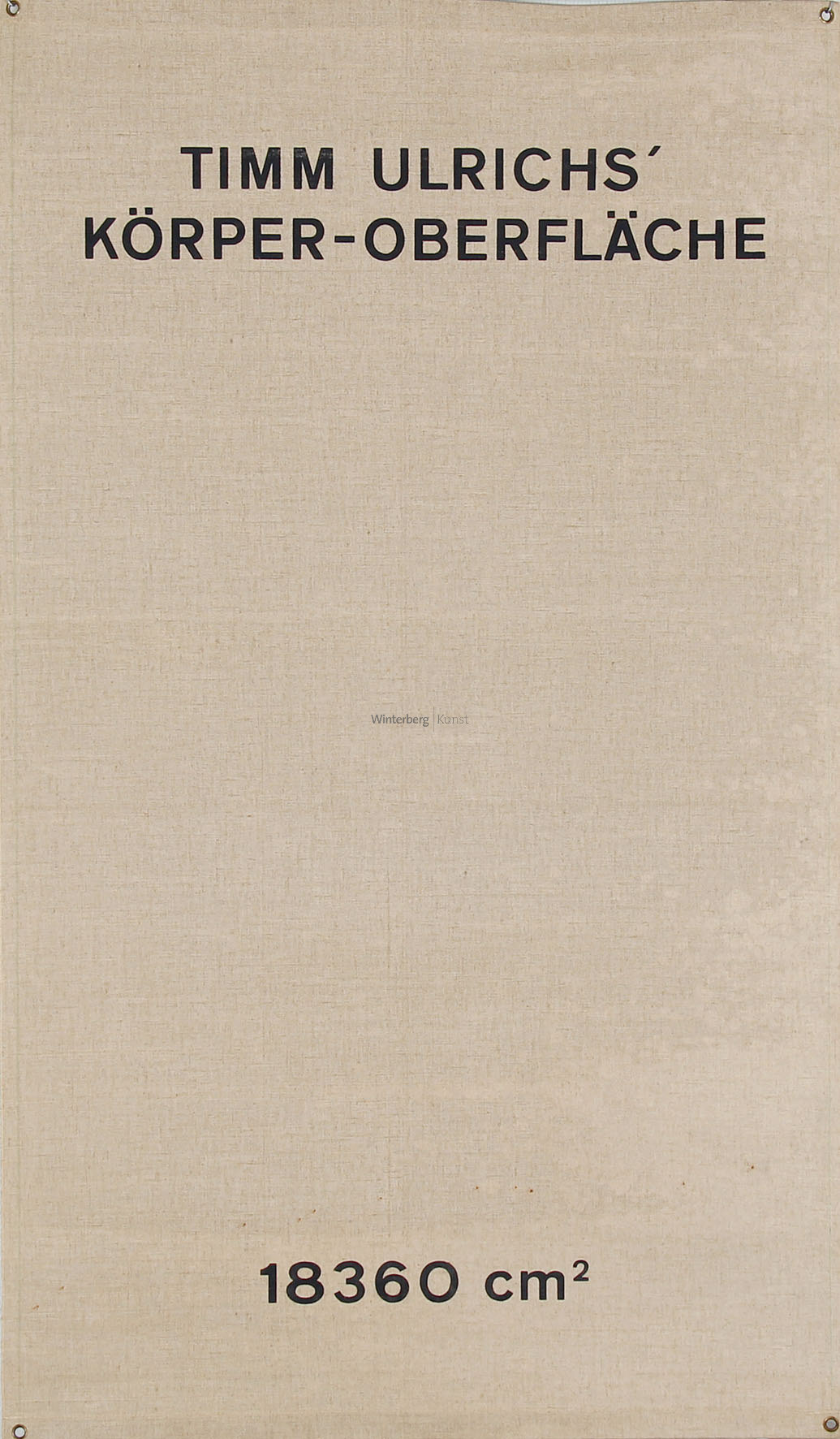 Expl. 81/100. Mit dem sérigraphierten Text „Timm Ulrichs’ Körperoberfläche“ und „18360 cm2„ am Ober- bzw. Unterrand. Verso auf appliziertem Etikett signiert und nummeriert sowie typographisch betitelt und bezeichnet „Edition Ring, Carmen Gantzert / 62 Wiesbaden An der Ringkirche 5 / Edition-Nr. 2“ bzw. „Stand: 19.9.1971“. 180 x 102 cm (Ober- und Unterrand gering eingefaltet). Im unteren Drittel mit vereinzelten braunen Fleckchen. Das vorliegende „Selbstportät“ simuliert die Körperoberfläche des Künstlers. Für dieses Projekt hatte Ulrichs seine Körperoberfläche genau auf die angegeben Quadratzentimeterzahl vermessen und übertrug dies auf eine Zeltplane in der gleichen Größe. [bg]