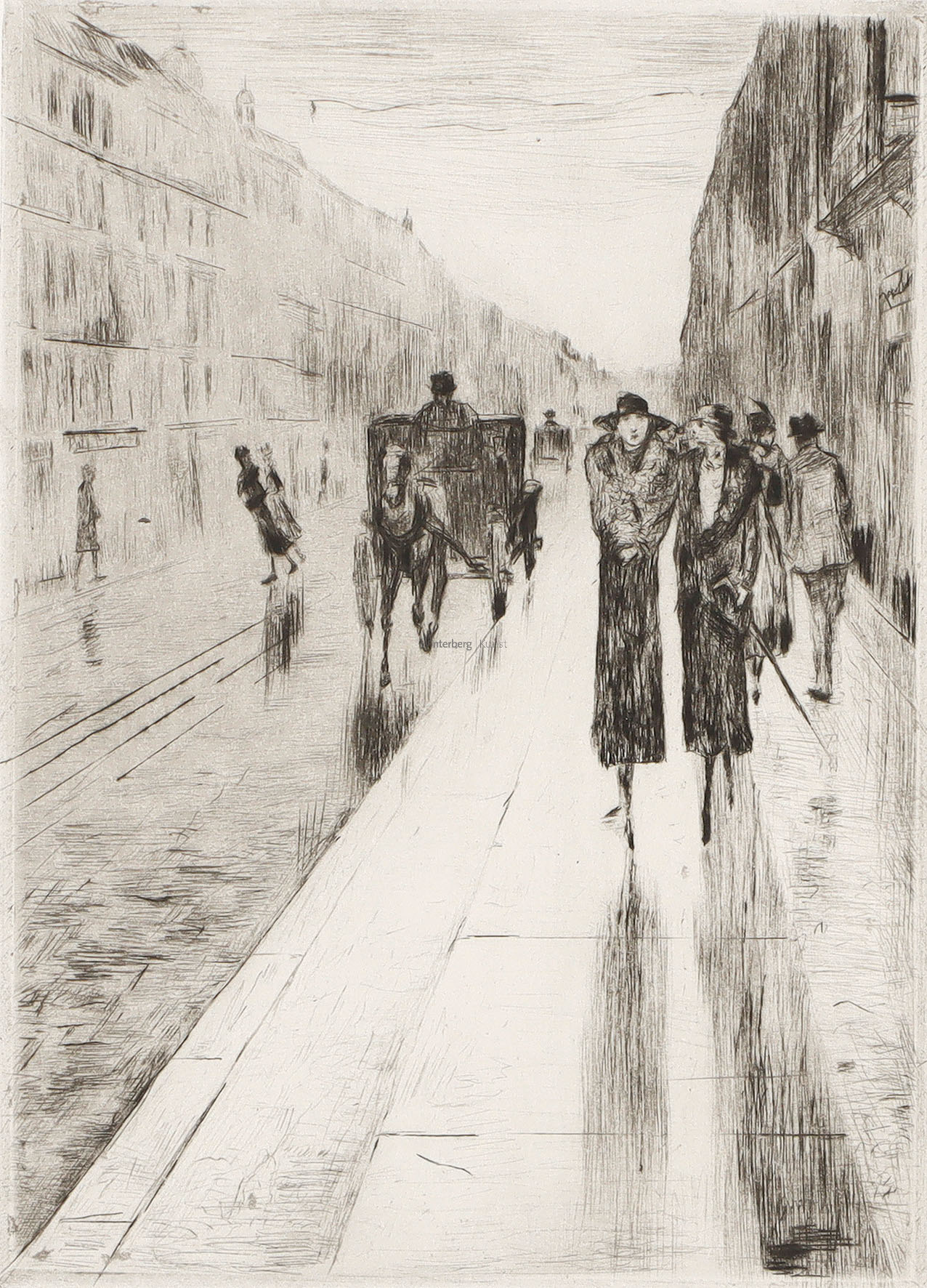 Spaziergänger im Regen vor Pferdedroschke. Kaltnadelradierung mit Aquatinta 1919.