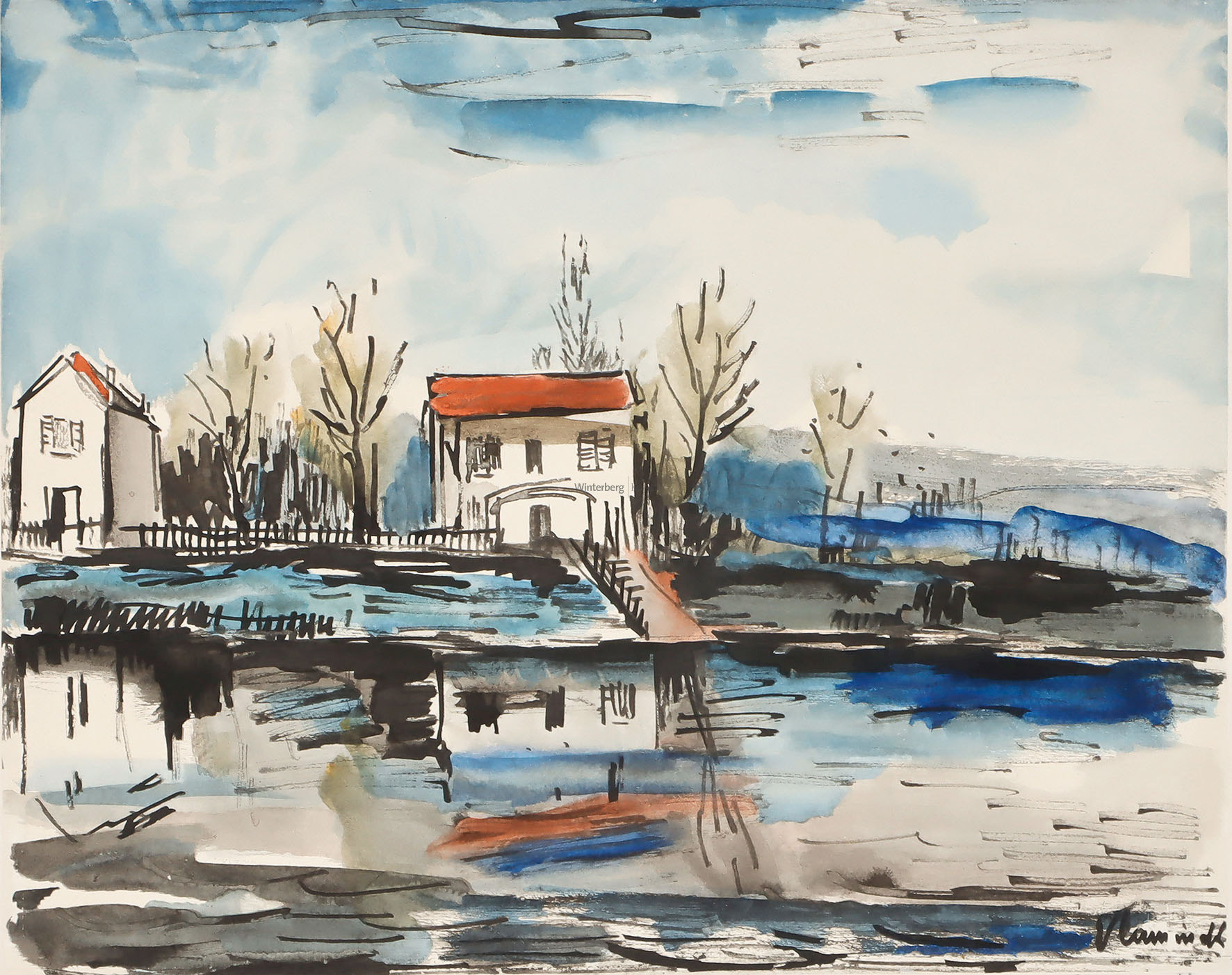 Bord de Rivière. Heliotypie (Lichtdruck) mit Pochoir von Guy Spitzer nach de Vlaminck 1956.