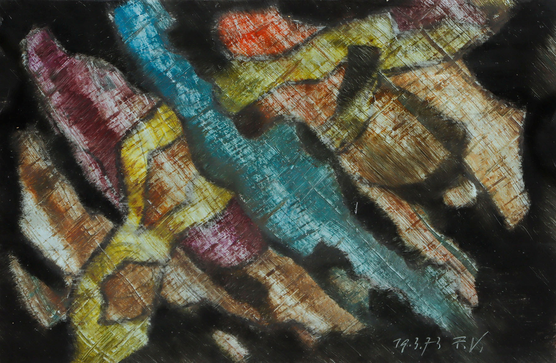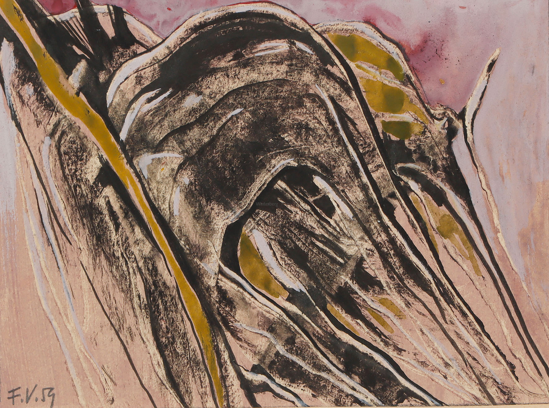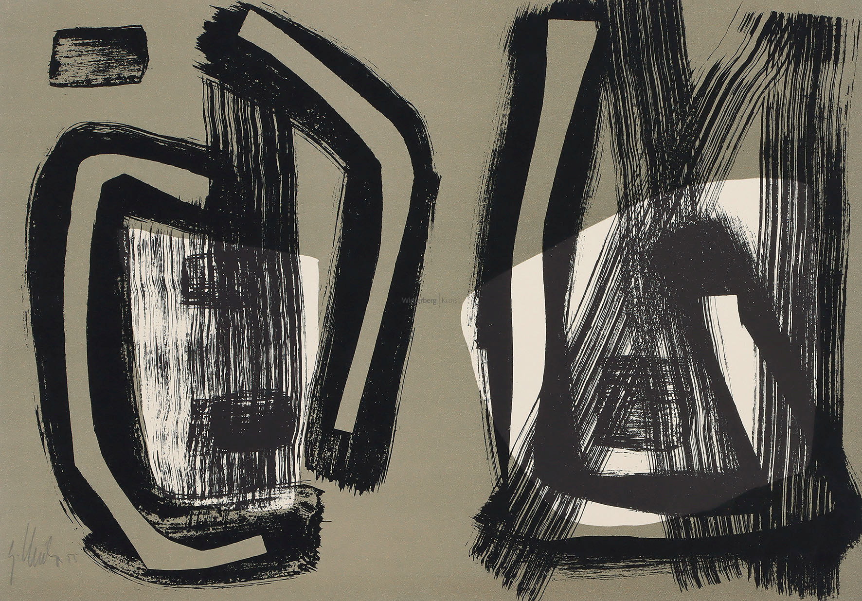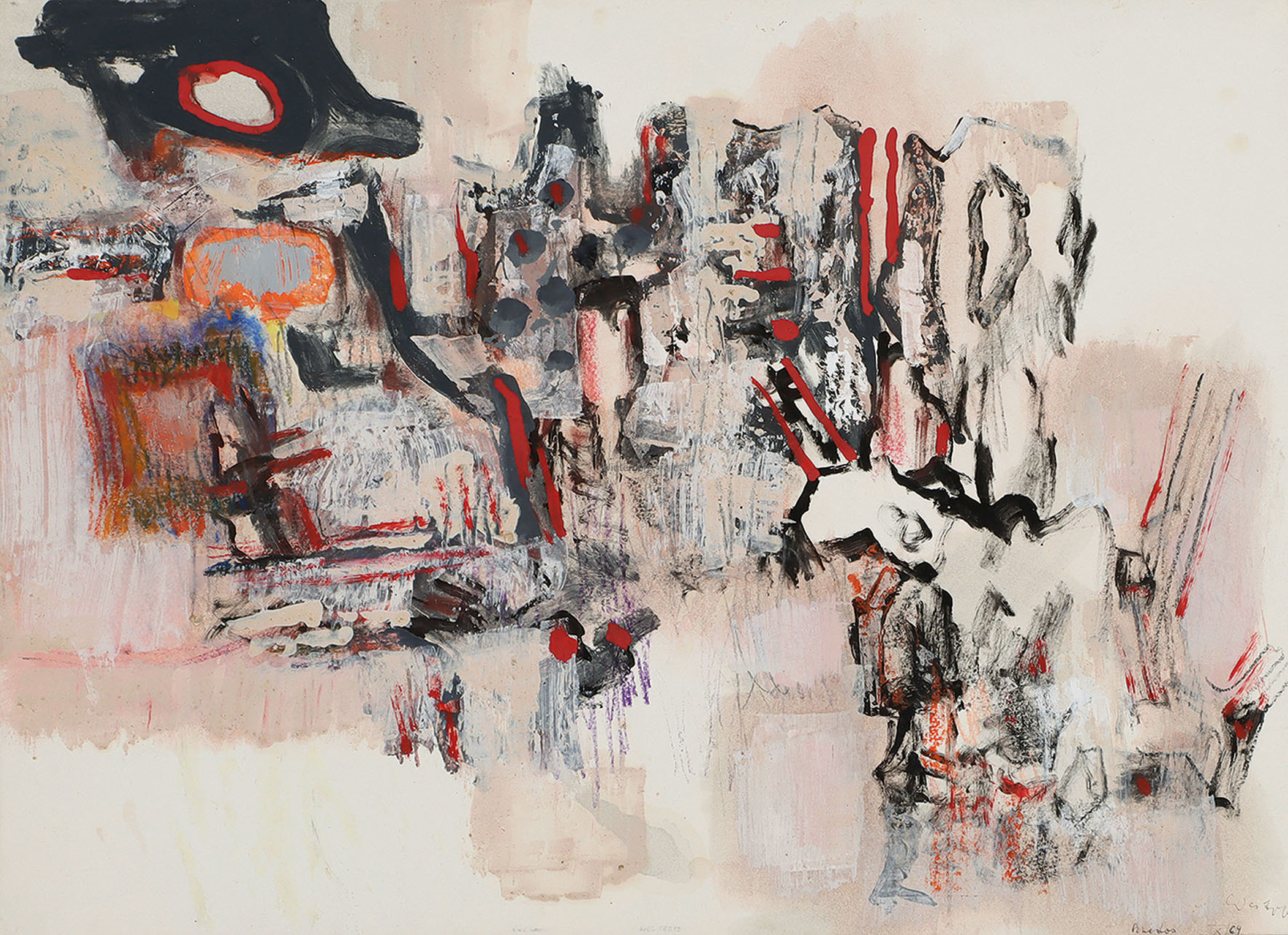 Rechts unten signiert, datiert „X/64“ und ortsbezeichnet „Rhodos“. Mit der Archiv-Nummer „6424010“ und „WES 18159“ in Bleistift am Unterrand. Auf leichtem Karton, auf Leinwand aufgezogen. 47 x 64,5 cm. Herbst 1964 hatte Westpfahl die Möglichkeit, 3 Monate in Griechenland zu verbringen und die staatlichen Ateliers auf Rhodos und in Delphi zu benutzen. Diesen Aufenthalt nutzte er intensiv und schrieb über seine künstlerische Entwicklung: „Das Viereck war nun nicht mehr umgrenzende Form, die den ersten Schritt in die Abstraktion bedeutet, sondern ein aus seiner Mitte heraus entgegengehaltener Leib für freie, unkorrigierbare Aufschrift. Das Offene schlechthin brachte fliegerische Erlebnisse zum Austrag, den zitternden Vorstoß ins Nichts“ (C.W.: Autobiographie. Typoskript. 1972. S. 5; zitiert im o.g. WVZ, S. 26). Gerahmt. [ms]