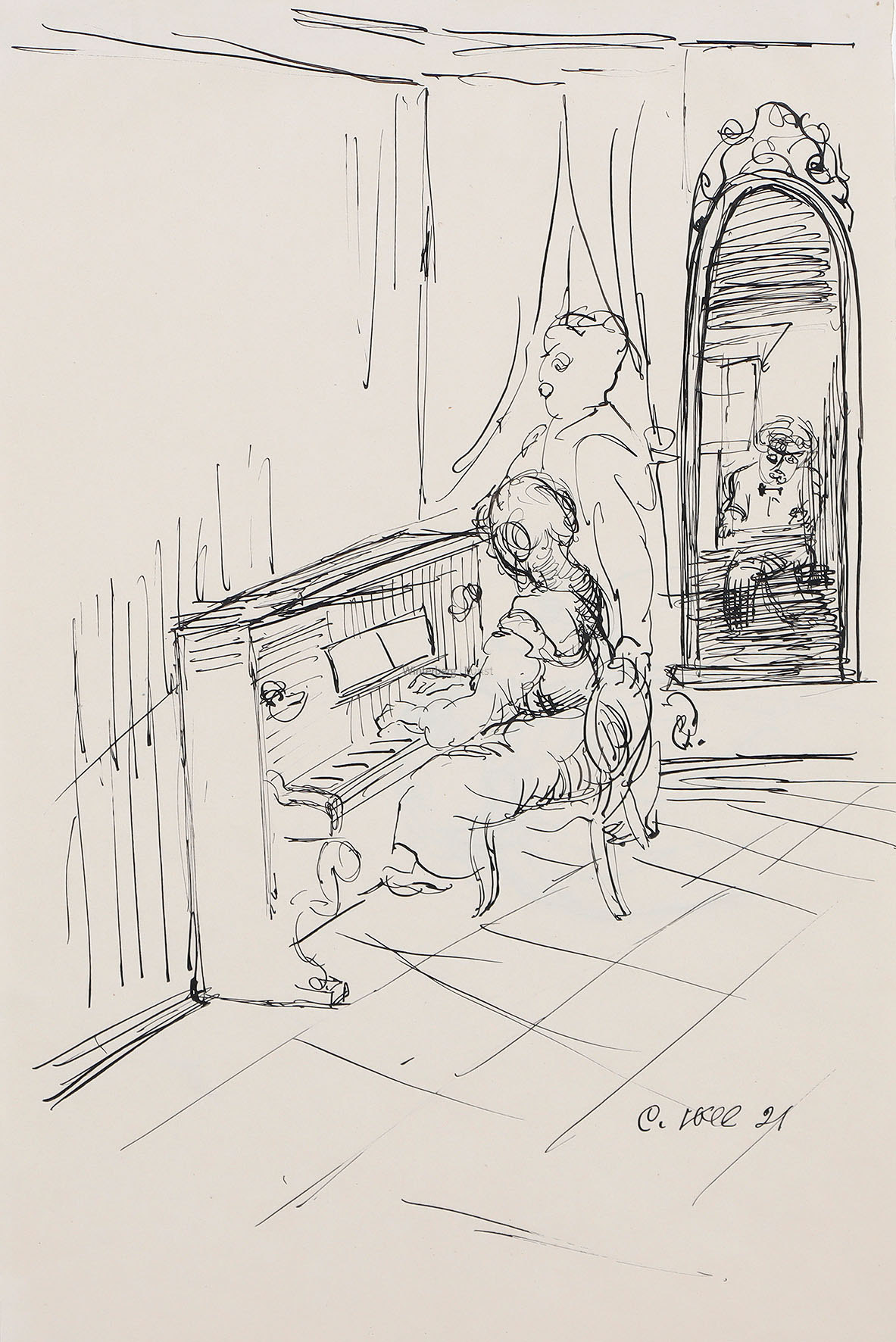 Salon mit einer Klavierspielerin. Tuschfederzeichnung 1921.