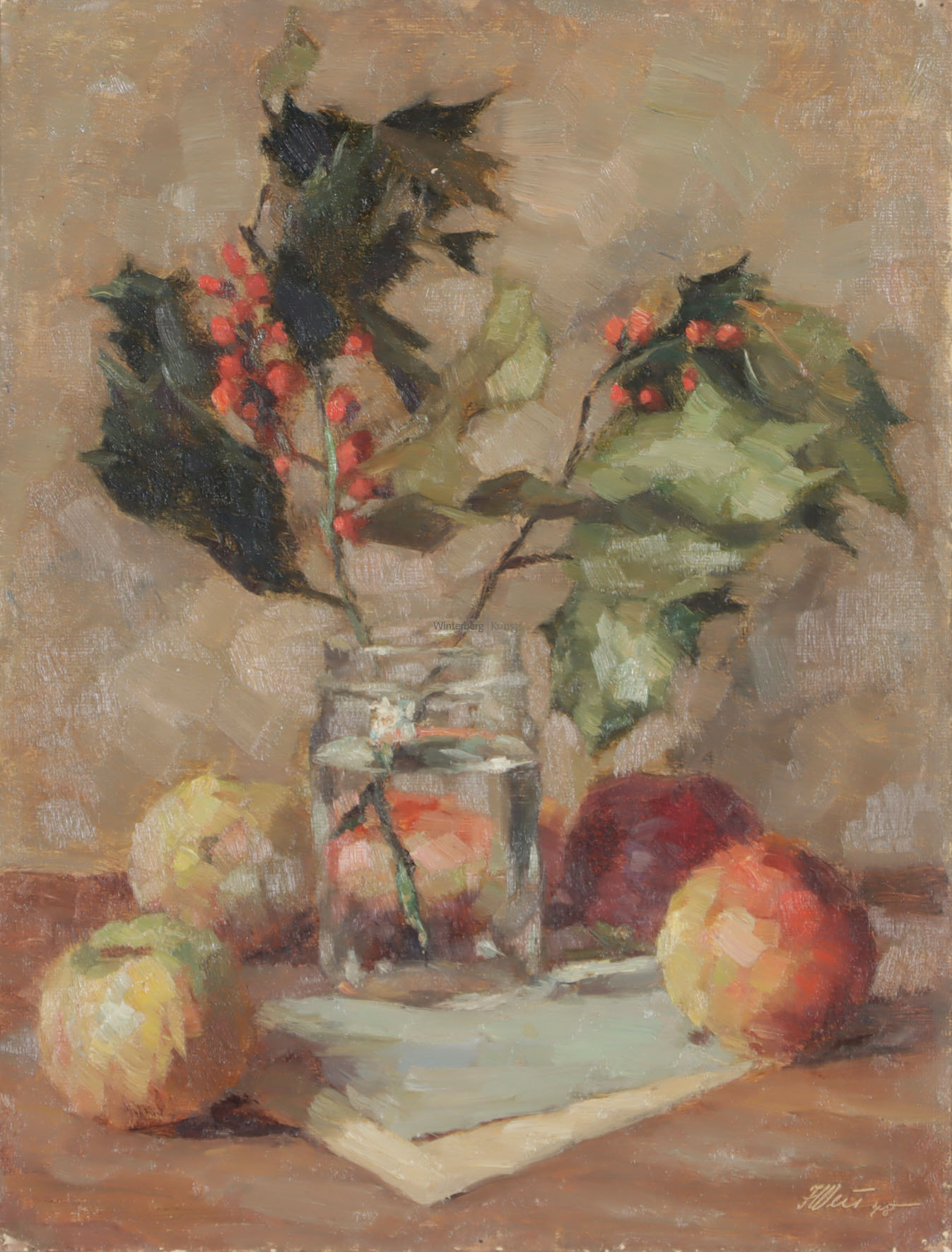 Stilleben mit Stechpalme in einem Glas und Äpfeln. Oel auf Leinwand, auf Karton aufgezogen, 1948.