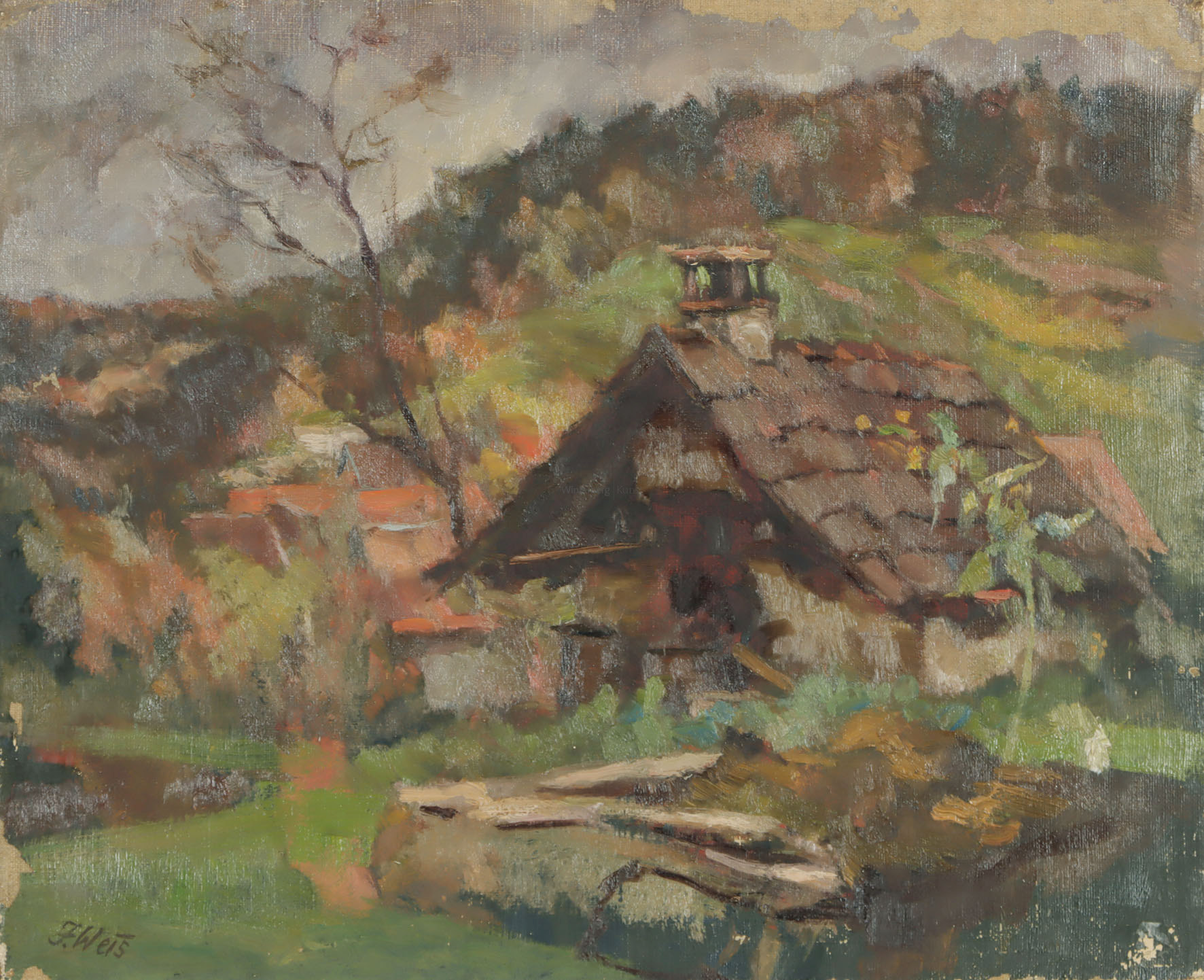 Mit in die frische Farbe eingeritzter Signatur und Datum. 34 x 26 cm. Ränder mit Nadelspuren und kleinen Bereibungen. Erste künstlerische Anleitung erhielt Weis von den Baden-Badener Malern H. Moritat, I. Puhonny und G. G. Hirth. Später besuchte er als Hospitant die Karlsruher Landeskunstschule, wo ihn O. H. Hagemann unterrichtete. Als Soldat in München verbrachte er seine Freizeit überwiegend in der Kunstschule „Die Form“ sowie im Schulatelier der „Kameradschaft der Münchener Künstler“, wo auch der Maler C. O. Müller unterrichtete. Ab den 1930er-Jahren bis zu seinem Tod war Weis Mitglied der Gutacher Malerkolonie in der Nachfolge von W. Hasemann und C. Liebich. Zeichnungen aus dieser Zeit werden im Kunstmuseum Hasemann-Liebich in Gutach aufbewahrt; ein Großteil seiner Werke befindet sich jedoch in Privatbesitz. 2012 ehrte das Museum Weis mit einer Gedenkausstellung [bg]