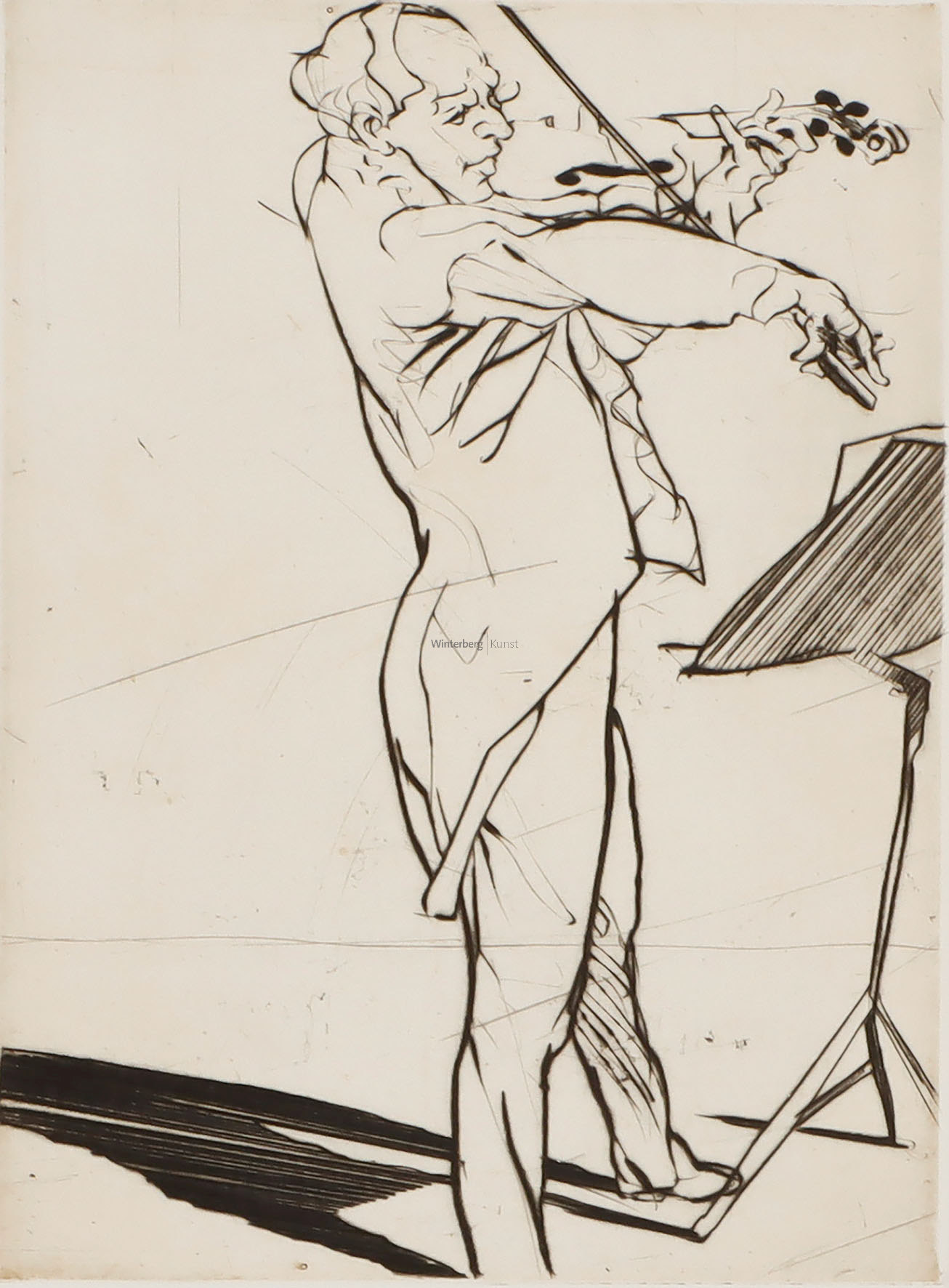 Violoniste. Kaltnadelradierung in Schwarzbraun über crèmefarbener Tonplatte.