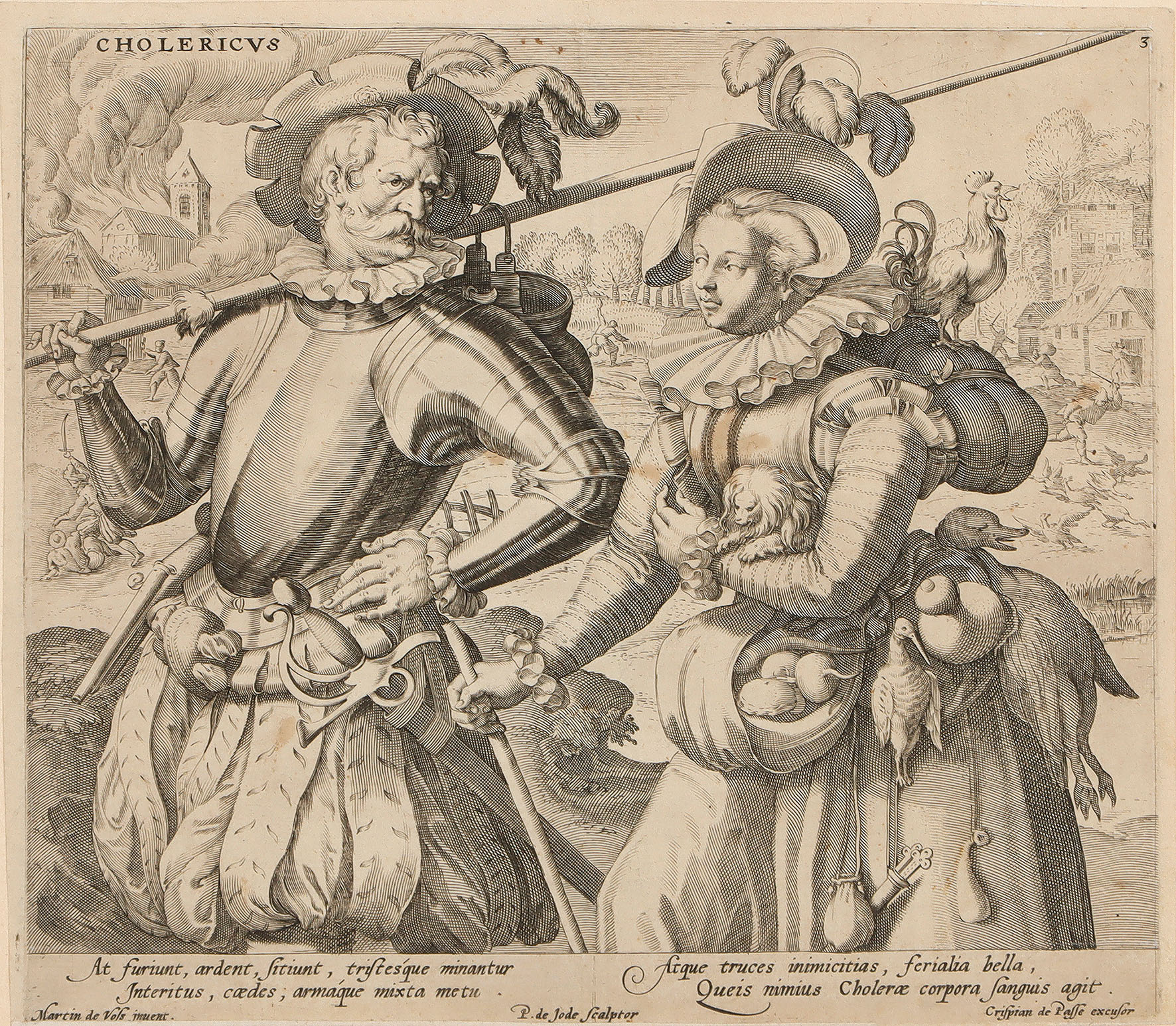 Cholericus. Blatt 3 der Folge „Die vier Temperamente“. Kupferstich von Pieter de Jode d.Ä. nach M. de Vos bei C. de Passe um 1595.