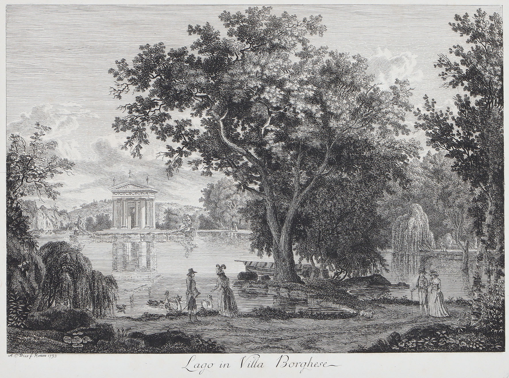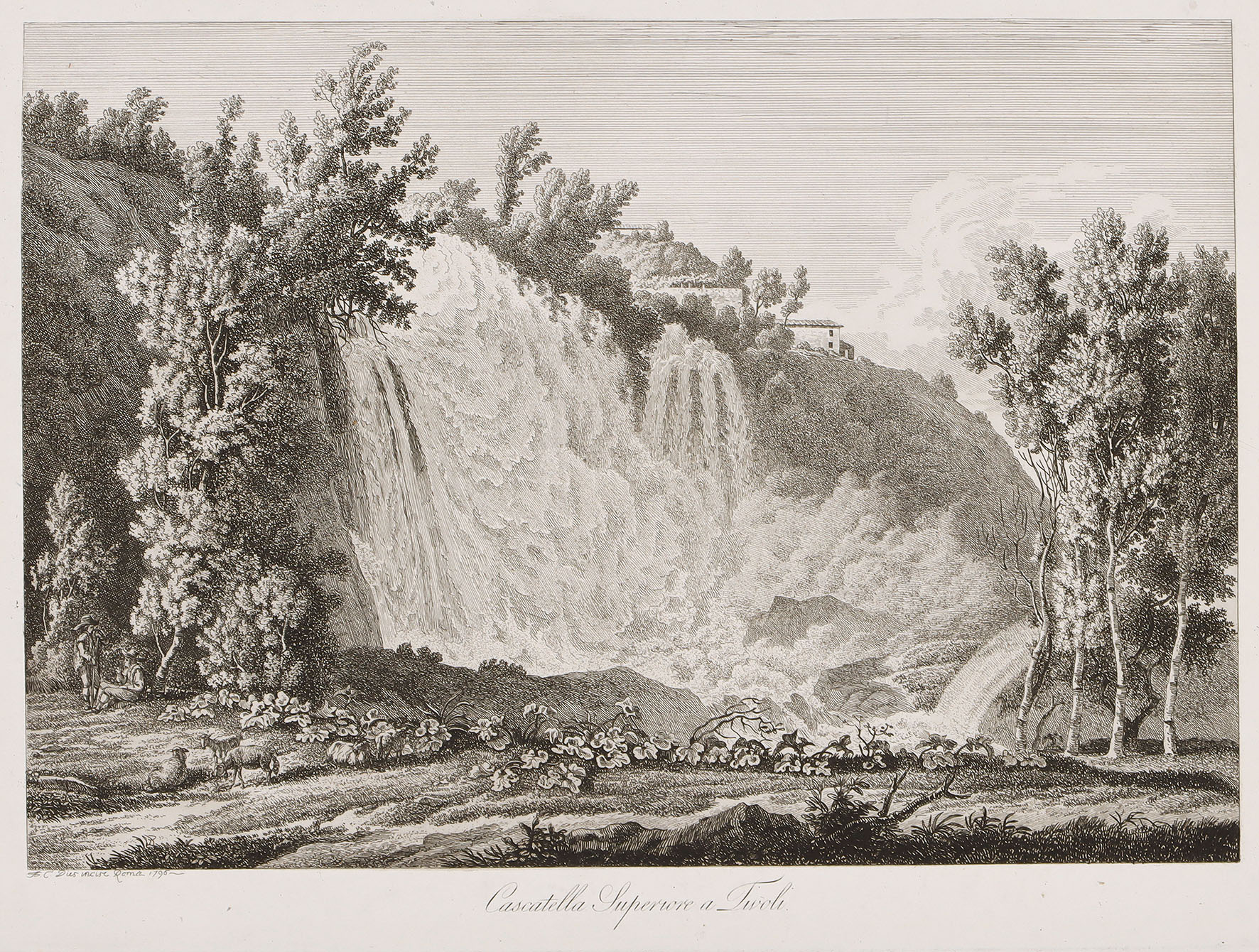 Links unten monogrammiert, datiert und bezeichnet „com. à Roma.“. Auf Bütten mit Wasserzeichen: Bekröntes Fleur-de-Lis-Wappen, alt aufgezogen auf „Bracciano“-Bütten. 18 x 27 cm (Darst.; mit Einfassung: 28 x 37,2 cm; Blatt: 30 x 39 cm). Mit vereinzelten schwachen bzw. kleinen Bleistiftspuren. Hauptsächlich außerhalb der Darstellung schwach fleckig. Verso mit leichten Klebespuren in den oberen Ecken. Stimmungsvolle idyllische Landschaft des bekannten Zeichners und Radierers, der 1764 erstmals Italien bereiste. Sammlung Richard Holtkott, Bedburg (Lugt 4266). [ms]