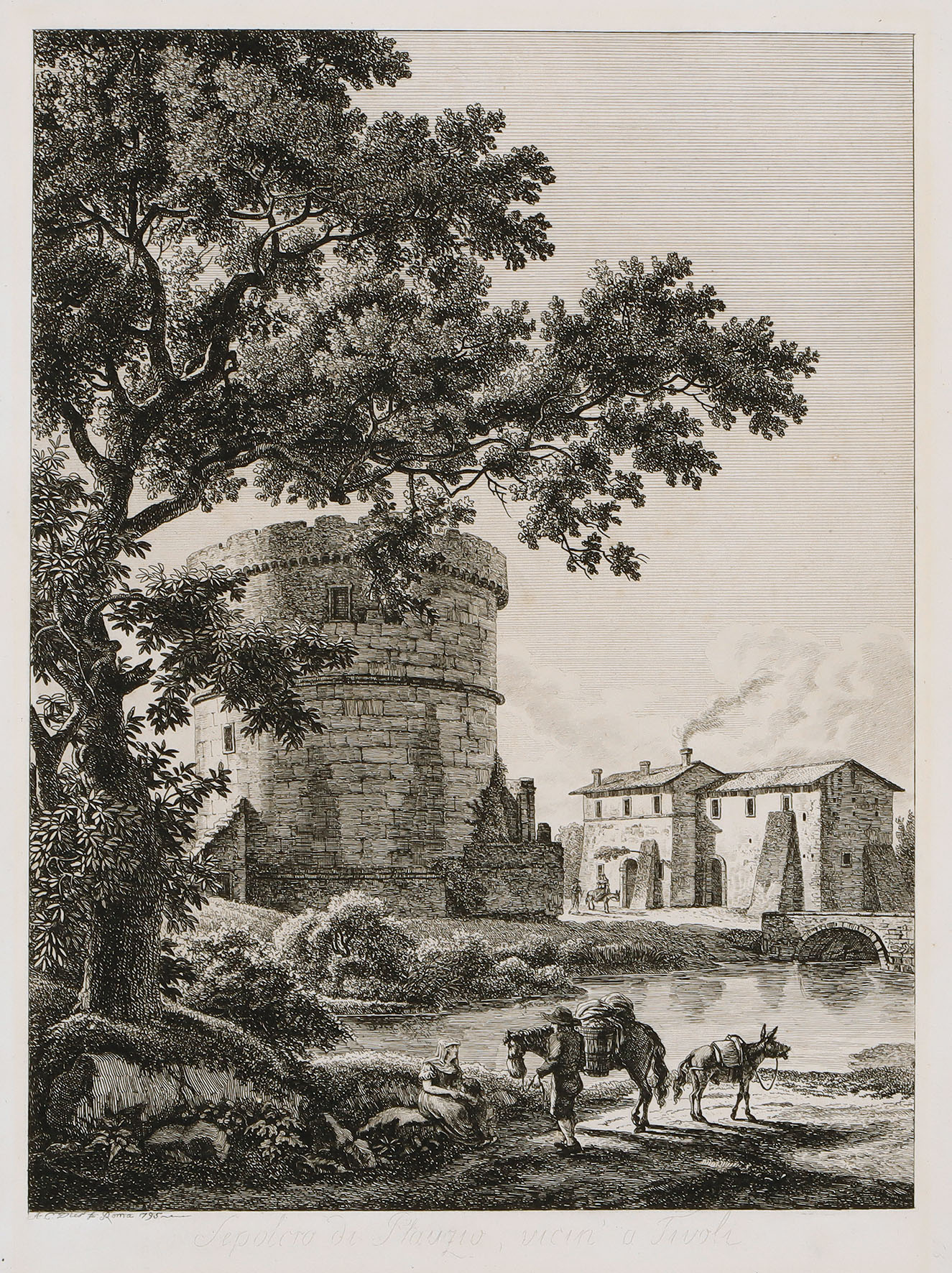 Cascatella di Tivoli – Tivoli – Terme di Caracalla – Lago in Villa Borghese – Avanzi della Villa di M. Bruto a Tivoli. Tivoli: Wasserfall – Gesamtansicht von Osten – Rom: Caracallathermen – Villa Borghese – Tivoli: Villa des Brutus. 5 Bll. Radierungen aus der Folge „Mahlerisch-radirte Prospecte von Italien“ 1792-94.
