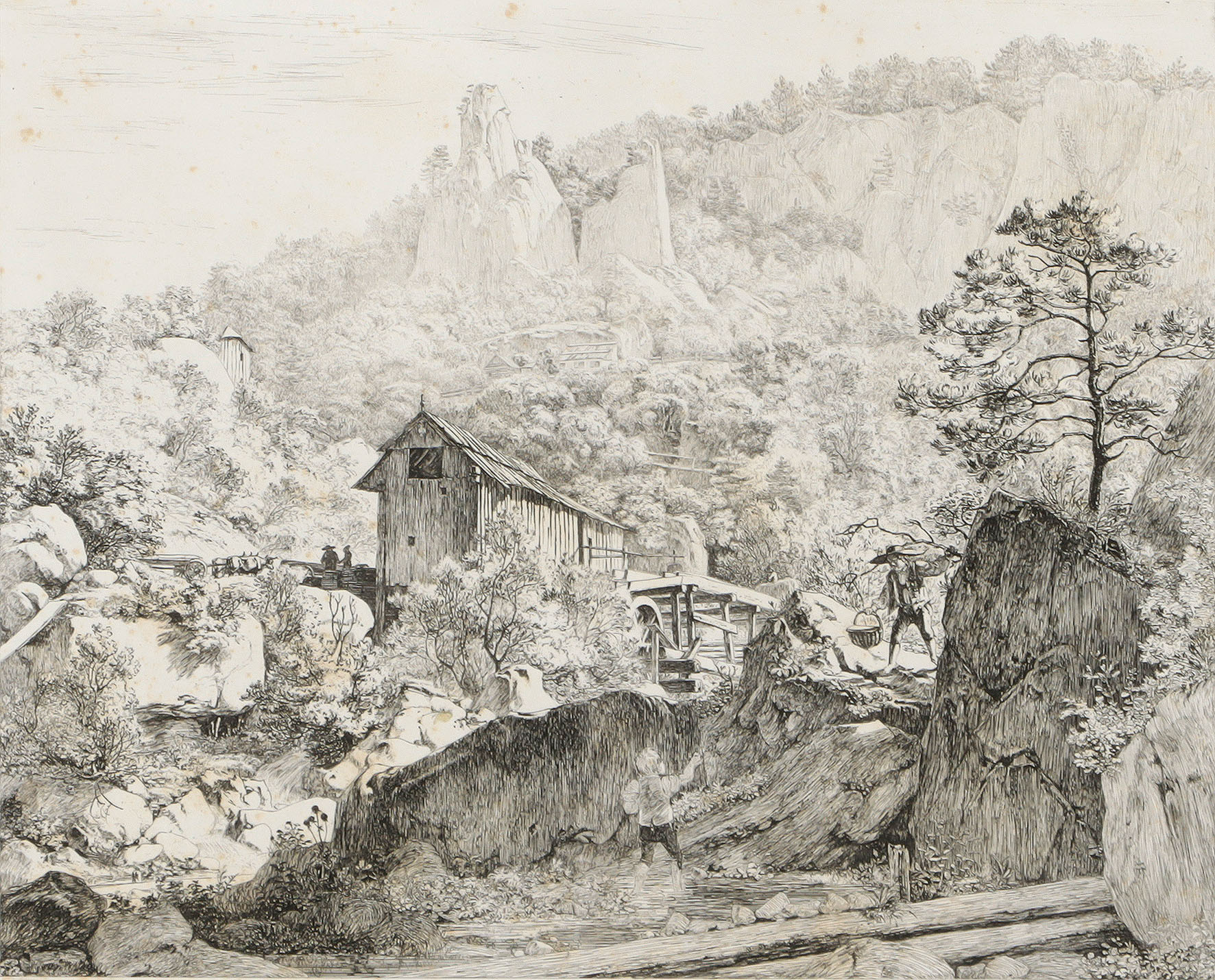 Bey Muckendorf. Felsige Landschaft in der Fränkischen Schweiz mit Sägemühle. Radierung mit leichtem Plattenton 1818.