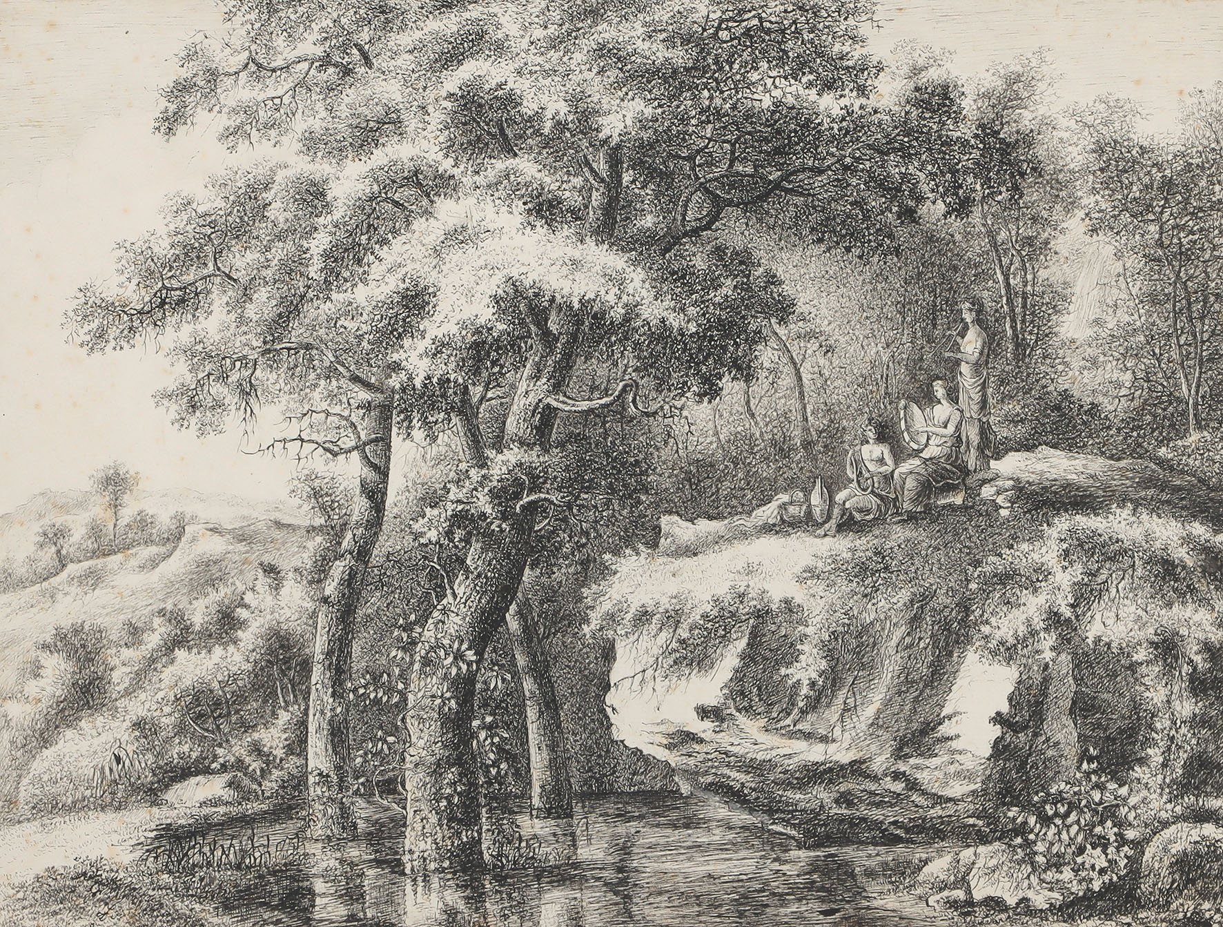 Bukolische Szene mit musizierendem Trio auf einem Fels am Wasser im Wald. Tuschfederzeichnung mit mehreren Einfassungslinien in Braun, um 1767.