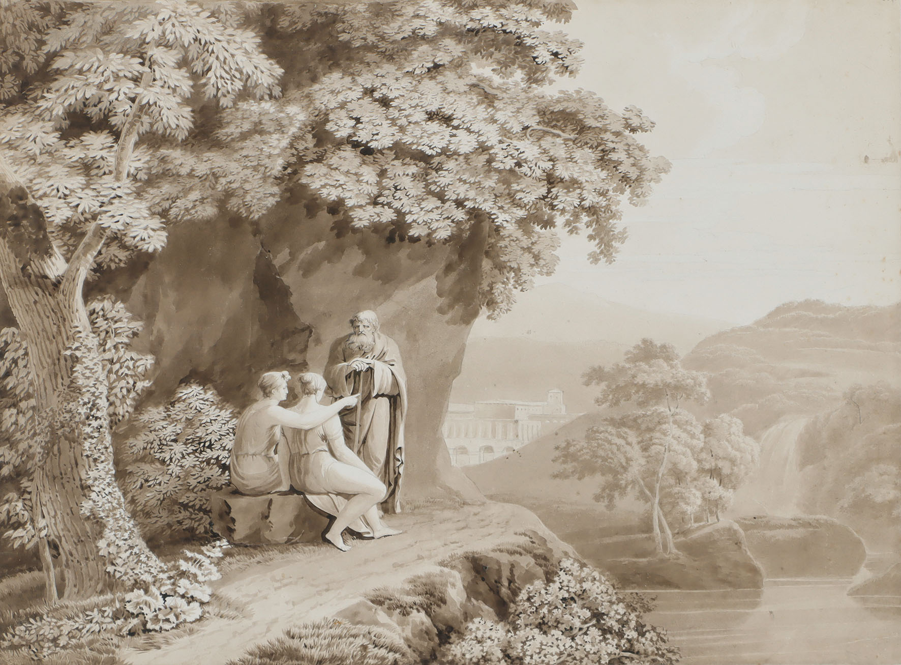 Ideallandschaft mit unter Bäumen sitzenden Frauen in antikisierenden Gewändern mit einem alten Mann, im Hintergrund eine Klosteranlage. Aquarell in Schwarzbrauntönen.
