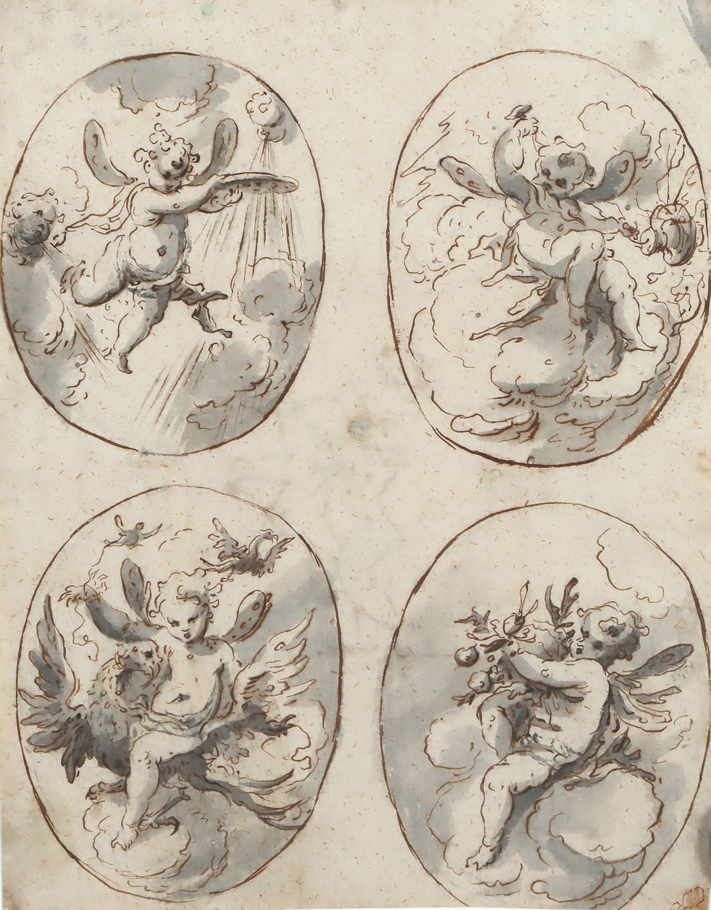 Die vier Elemente: Wasser – Feuer – Luft – Erde. Vier allegorische Darstellungen im Hochoval, personifiziert durch Putti, auf einem Blatt. In Grau lavierte Federzeichnung in Braun.
