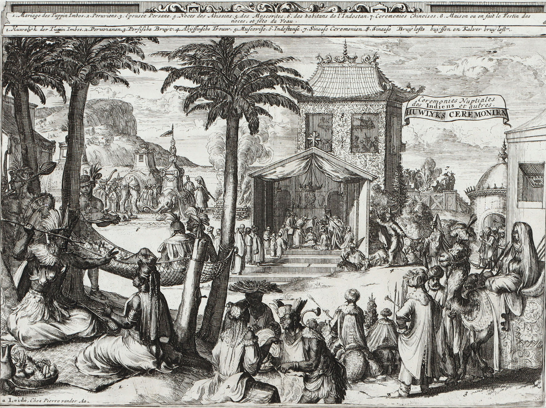 „Ceremonies Nuptiales des Indiens et autres. Huwlyks Ceremonien“. Hochzeitszeremonien und -trachten verschiedener Länder. Kupferstich aus der Folge „Les Indes orientales et occidentales…“ bei P. van der Aa, Leiden, um 1700.