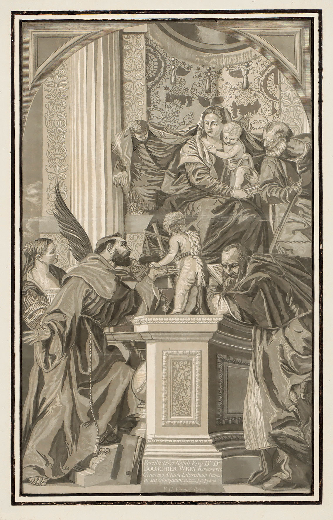 Die Heilige Familie mit vier Heiligen. Clair-obscur in Graugrün von mehreren Druckstöcken nach Pablo Caliari (Veronese) 1739.