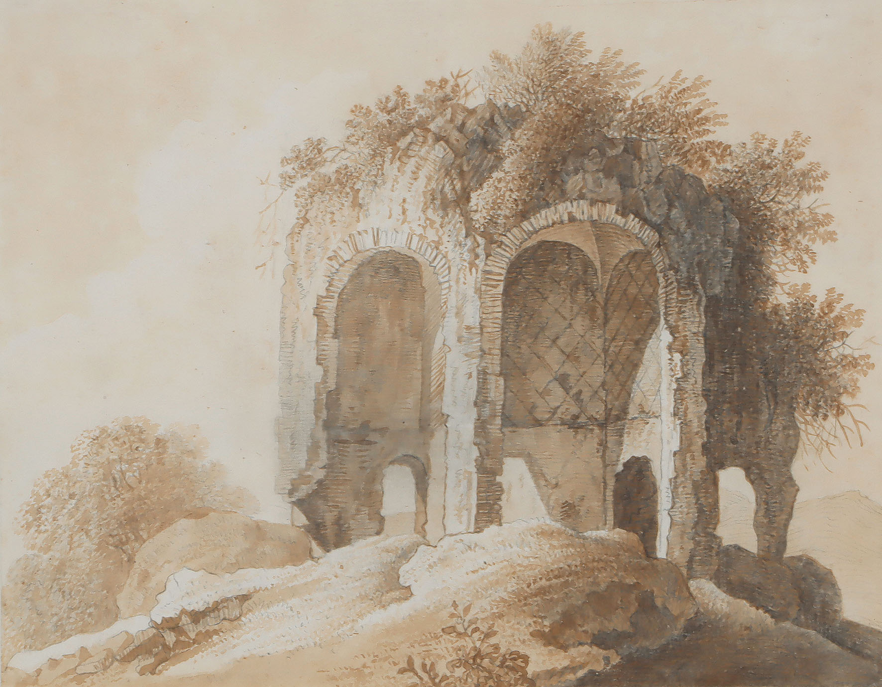 Bewachsene Tempelruine: Das Nymphäum des Tempels der Minerva Medica auf einem Hügel. Pinselzeichnung in Braun über Bleistift.