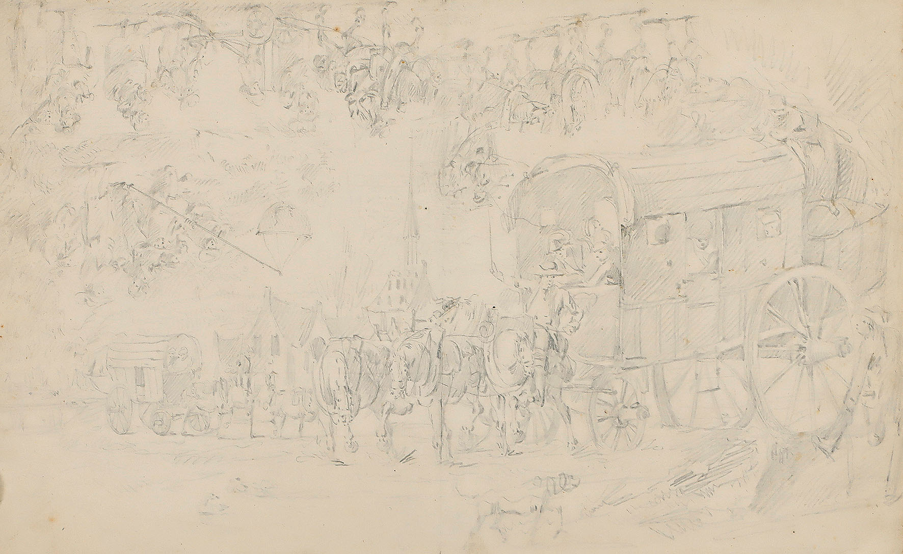 Auf leichtem chamoisfarbenem „HR“-Bütten. 23,9 x 38,8 cm. Mit geglätteter Mittelfalte. Schwach fleckig, geringfügig gebräunt und mit meist winzigen Randläsuren. Stellenweise (Pferdegespann des großen Wagens) mit Griffelspuren. Vermutlich aus einem Skizzenbuch. [ms]