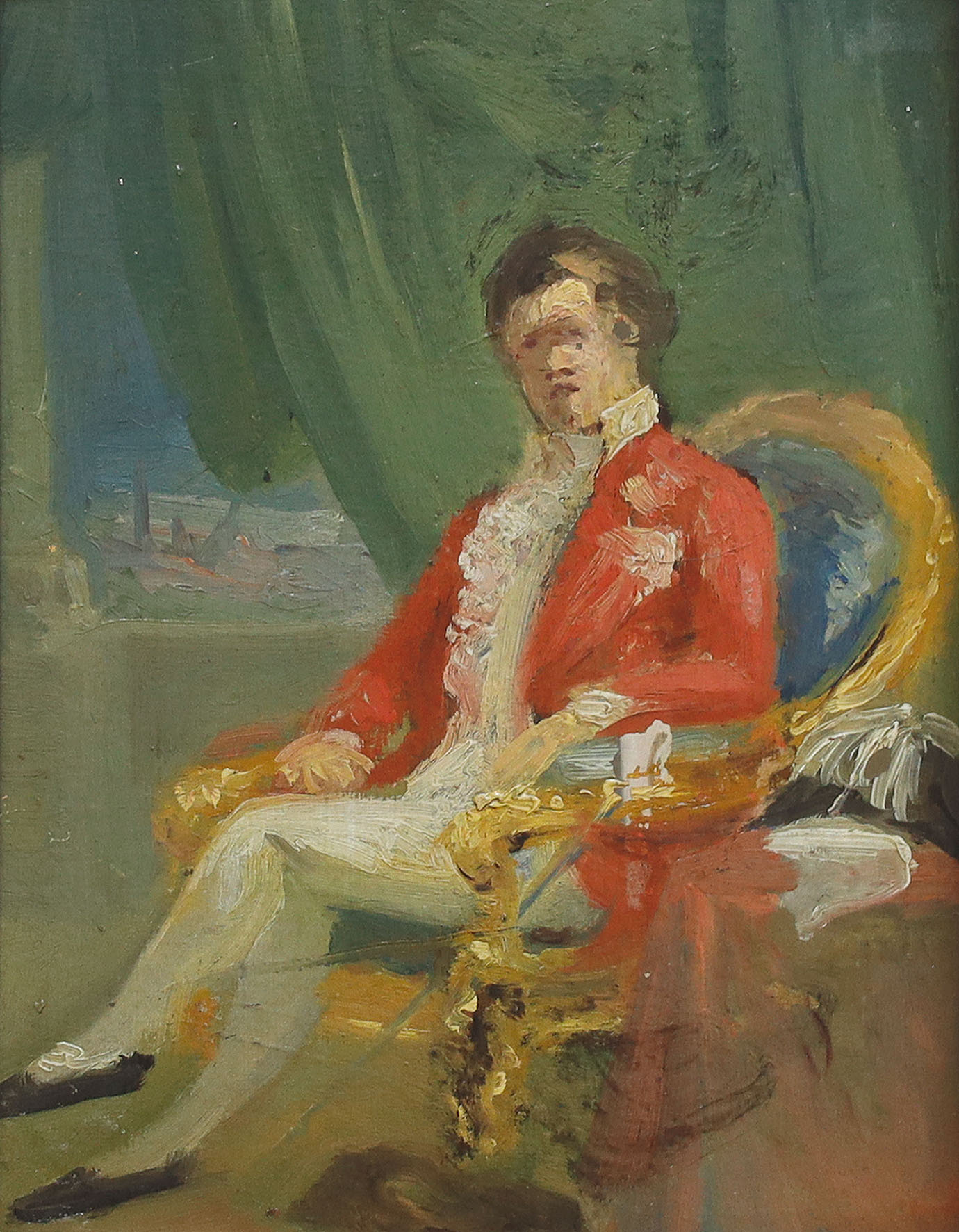 Il Diplomatico. Sitzender Diplomat in weißer Kleidung und rotem Gehrock. Oelstudie auf Karton.