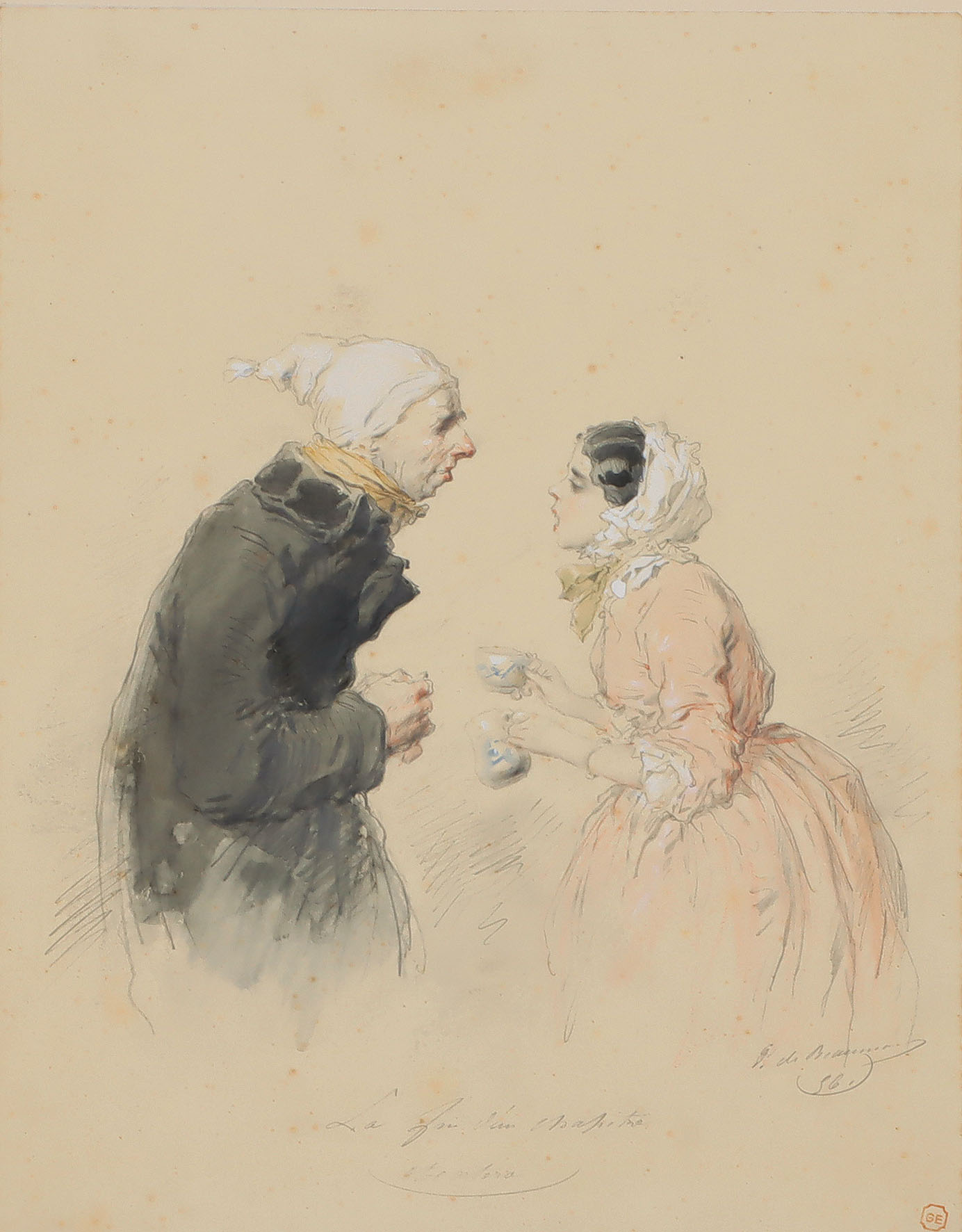 „La fin d’un chapitre et cetera“. Junge Frau spricht angeregt mit einem gebannt lauschenden Mann mit Nachtmütze. Stellenweise in Deckweiß gehöhte und aquarellierte Bleistiftzeichnung, vermutlich Vorstudie zu einer Illustration 1856.