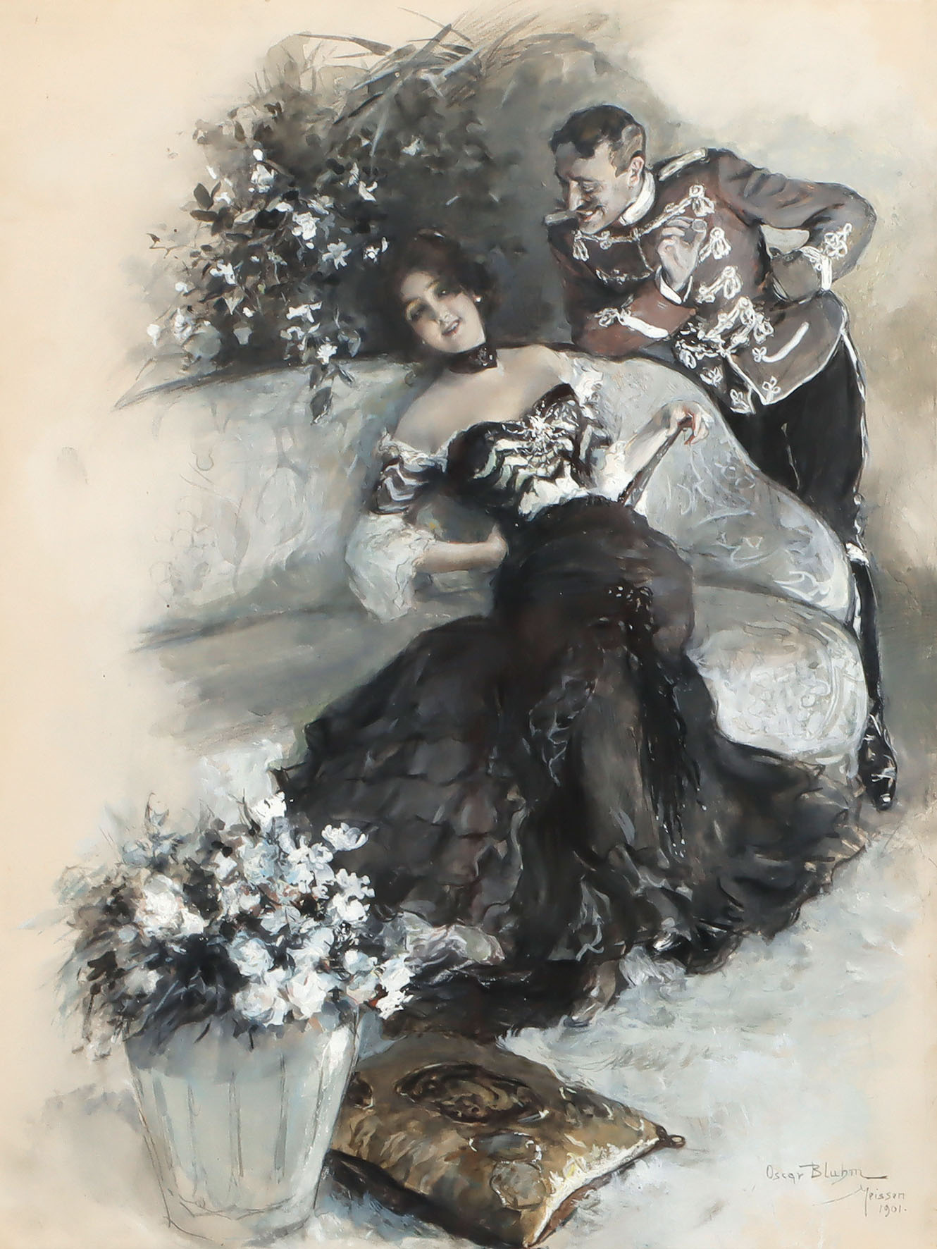 Signiert, datiert und ortsbezeichnet „Meissen“. Auf Vélin. 41,8 x 32 cm. Schwach fleckig. Unter Blende montiert. Oskar Bluhm, der bei Ferdinand Keller an der Karlsruher Kunstakademie studiert hatte, fand beim Publikum großen Anklang mit seinen liebevoll und detailreich ausgeführten Szenen, die vielfach Offiziere und Damen der Gesellschaft zeigen, wie bei der vorliegenden, fast in Grisaille-Manier gehaltenen Szene. Provenienz: Galerie von Abercron, München; Lempertz, Köln; Galerie Fach, Frankfurt/M. [ms]