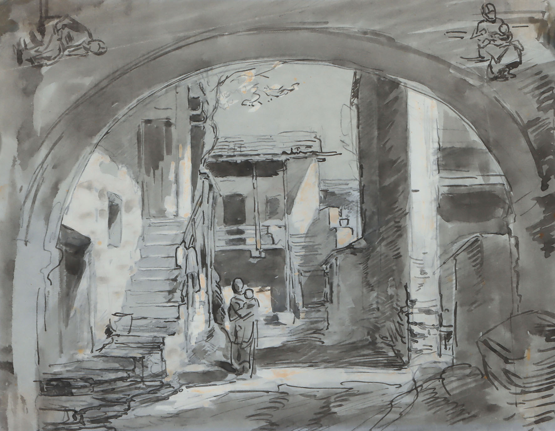 Blick durch einen Torbogen auf eine Mutter mit Kind bei einer Haustreppe. In den oberen Ecken Studien sitzender Figuren. Weiß- und orangegehöhte Pinselzeichnung in Grau mit Bleistift.