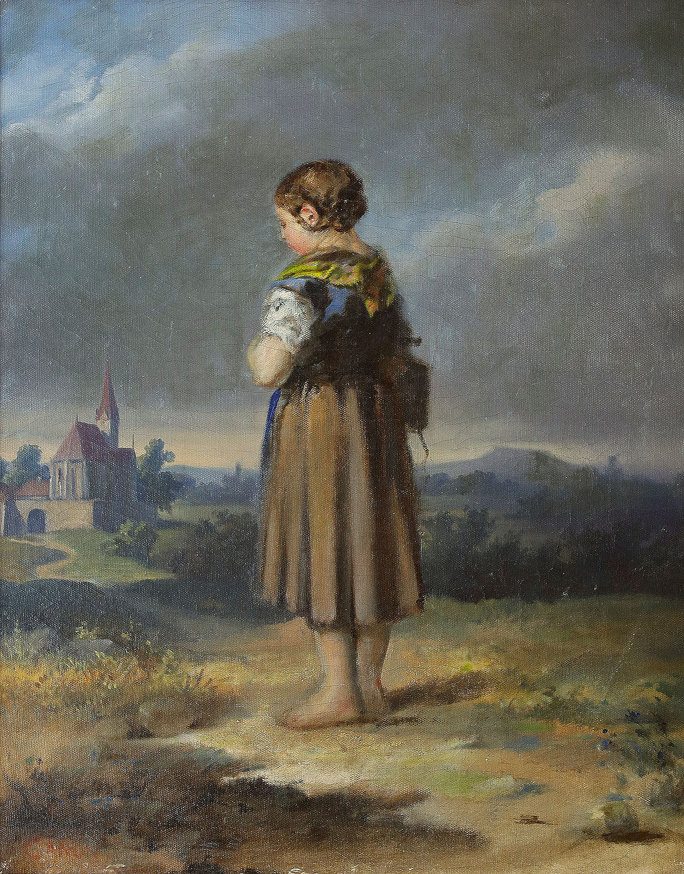 Schulmädchen in Tracht auf dem Weg zur Dorfkirche. Oel auf Leinwand.