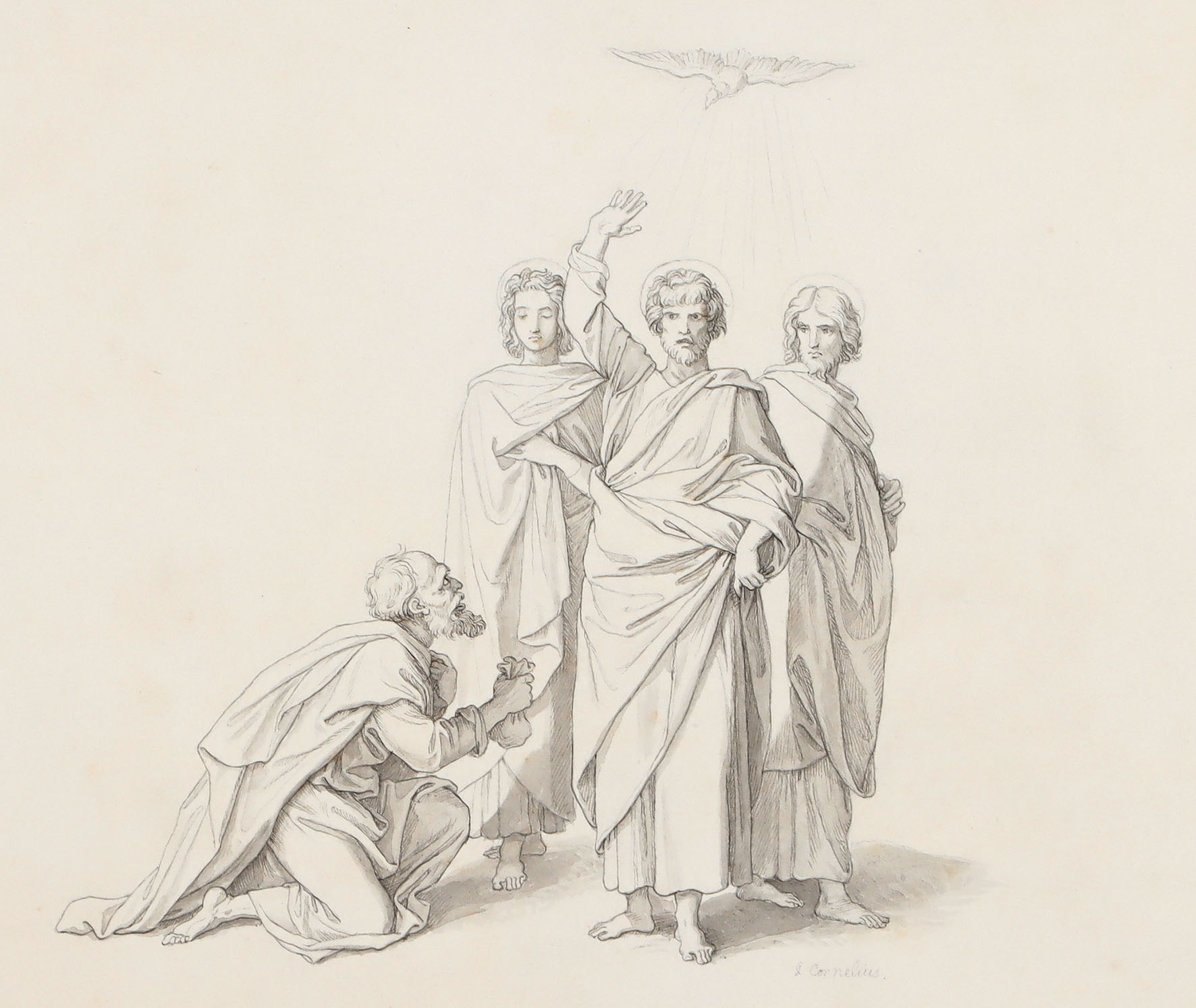 Rechts unterhalb der Darstellung signiert. In der linken unteren Blattecke mit Bibelreferenzangabe in Bleistift von fremder Hand. Auf leichtem chamoisfarbenem Karton. 33 x 41 cm. Breiter Randbereich schwach fleckig und leicht angestaubt. 1811 ging Cornelius nach Rom, wo er sich mit Friedrich Overbeck anfreundete, Mitglied des Lukasbundes wurde und als ein Hauptvertreter des Nazarenerstils galt. [ms]