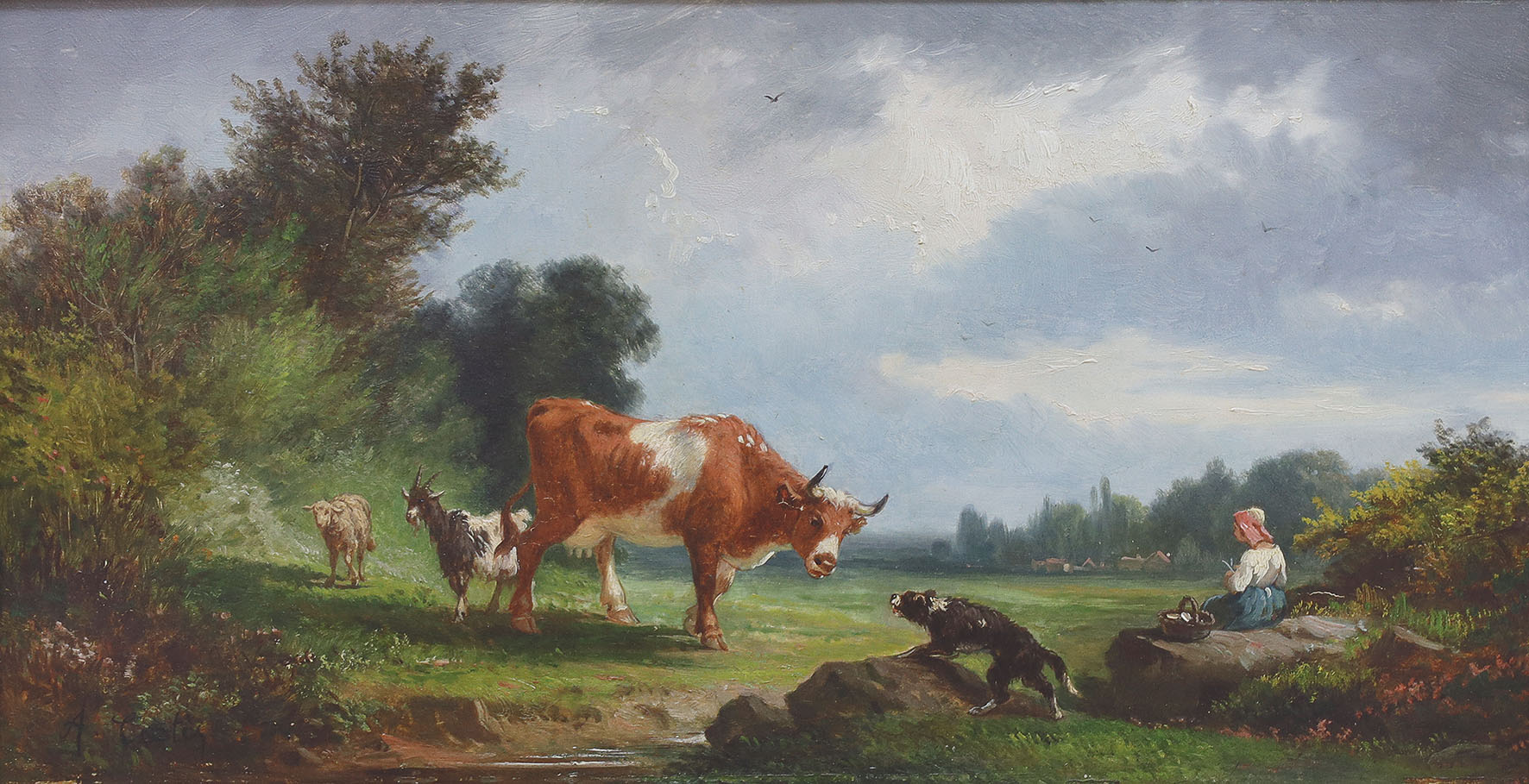 Weidelandschaft mit einer Kuh, Ziege, Schaf und Hund sowie einem strickenden Hirtenmädchen. Oel auf Holz.