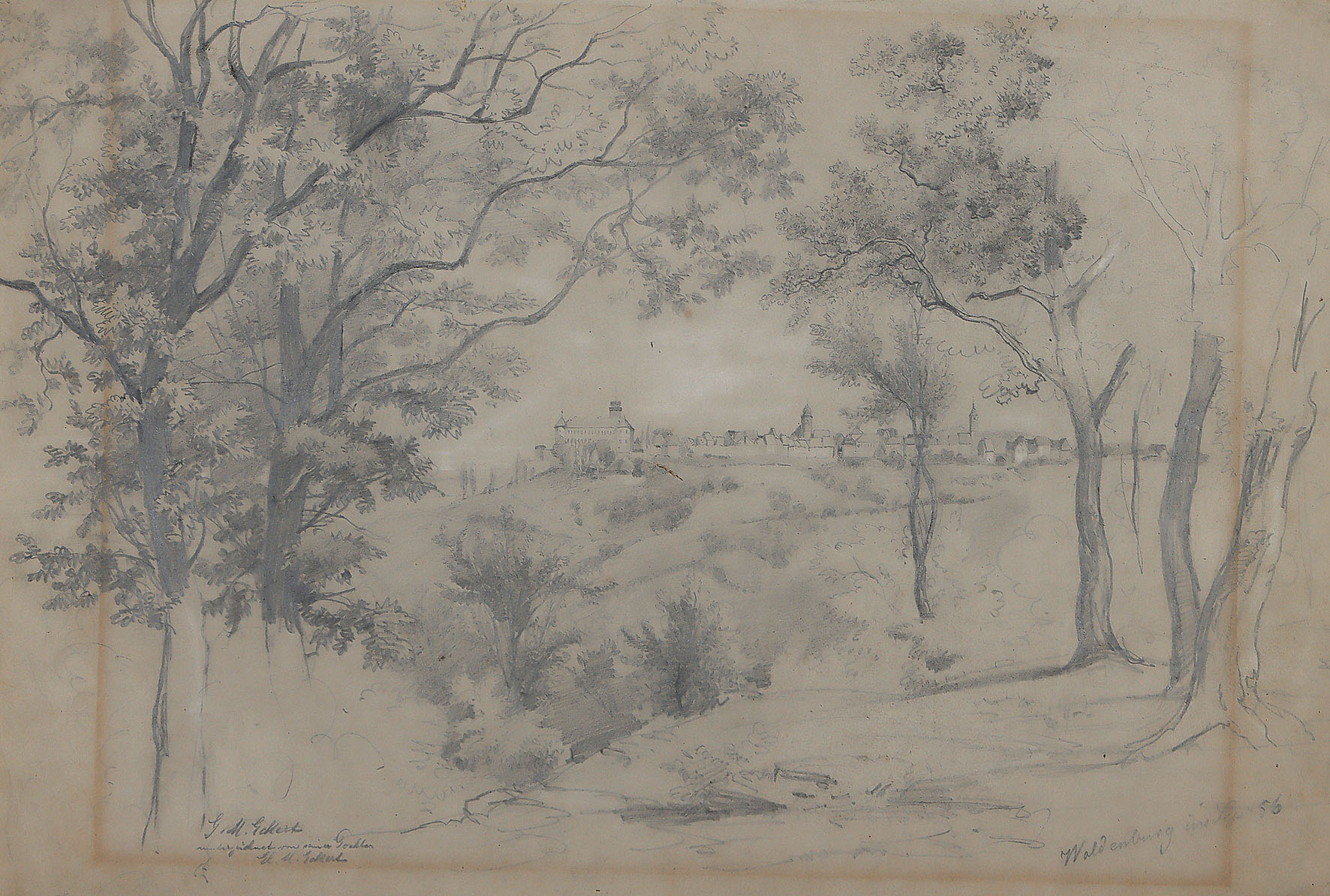 Blick von der Ferne auf Waldenburg – „Heidelberg, Schloss Eingang zum Faß“ – Heidelberg, Blick vom Schlossgarten auf den gesprengten Turm. 3 Bll. teils gewischte Bleistiftzeichnungen (davon Bl. 2 mit zarter Aquarellierung in Ocker) um 1856.