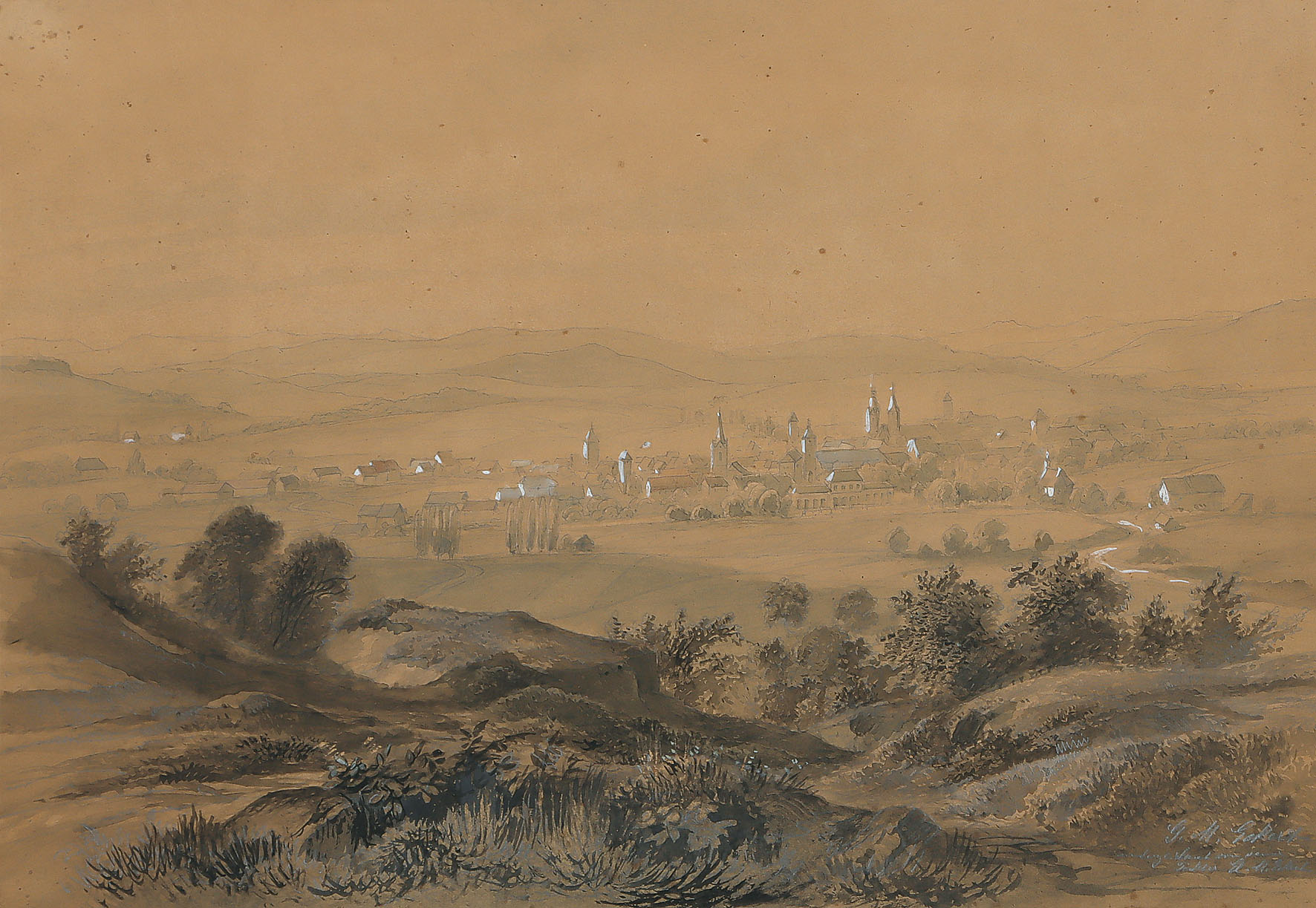 In einer Ebene gelegenes Städtchen, im Hintergrund Hügellandschaft. Stellenweise in Deckweiß gehöhtes und in Zartrot akzentuiertes Aquarell in Grautönen über Bleistiftvorzeichnung.