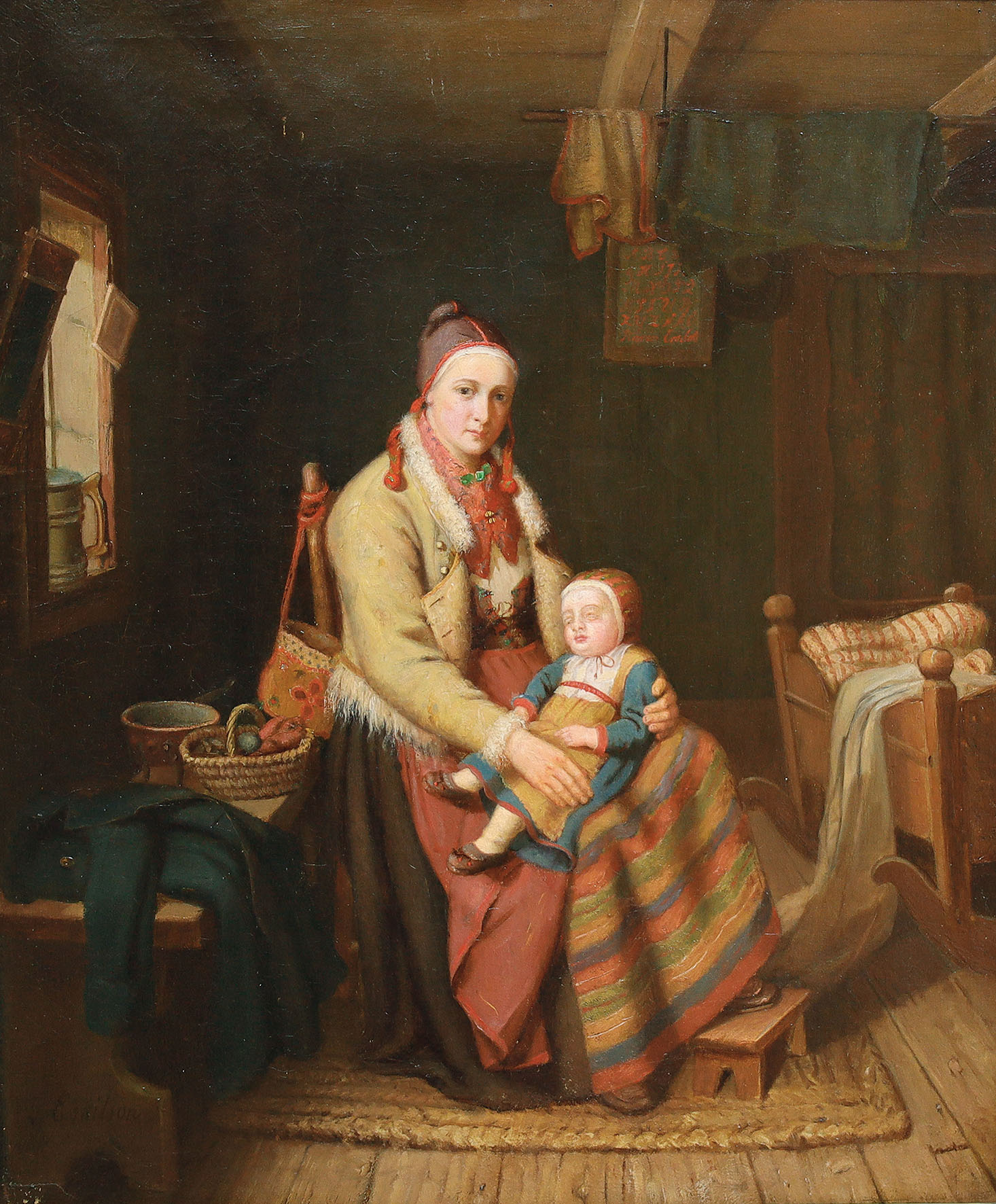 Sitzende schwedische Bauersfrau mit Kind in der Stube. Oel auf Leinwand.