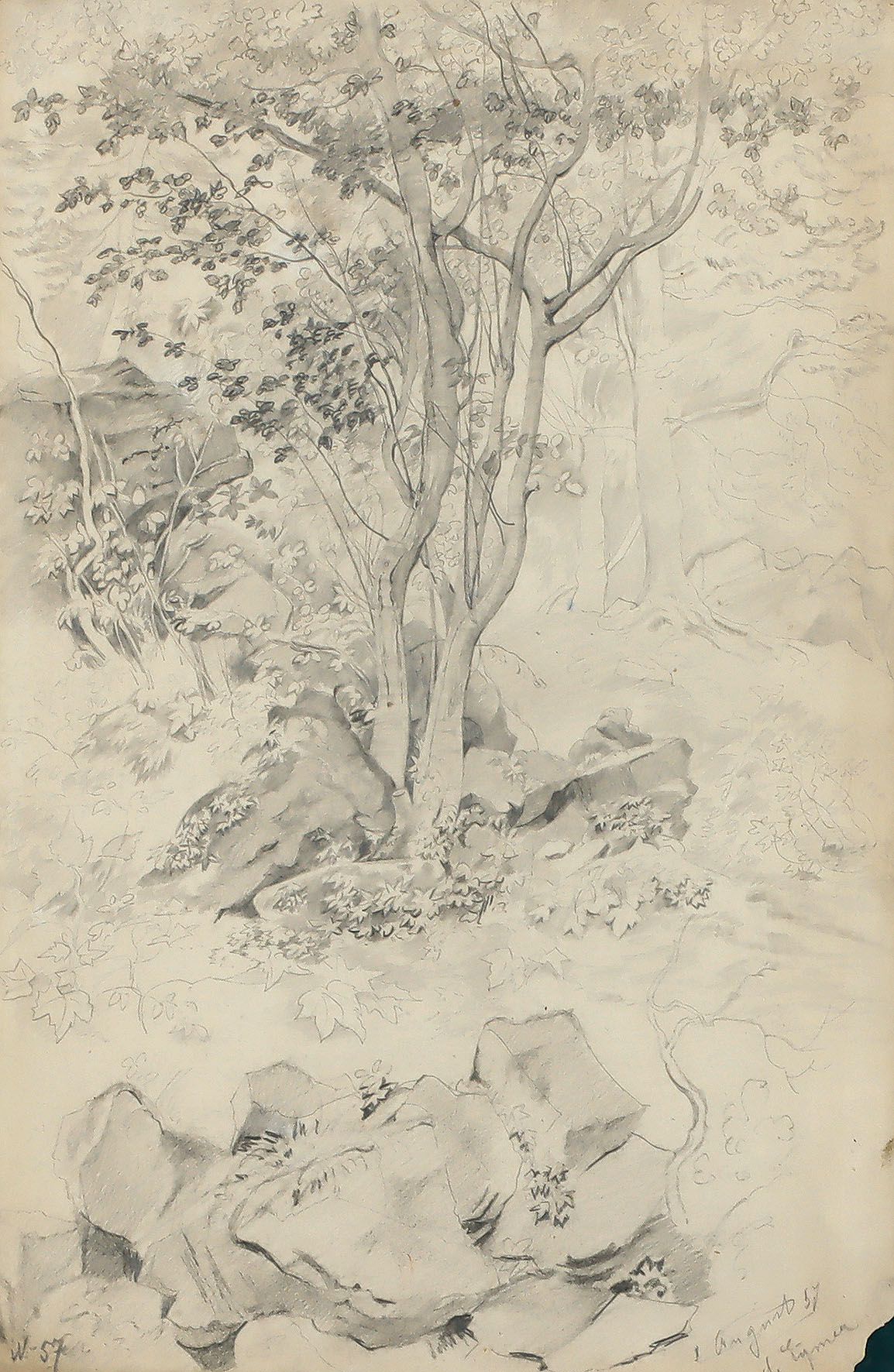 Felsige Baumlandschaft. Landschaftsstudie. Stellenweise gewischte Bleistiftzeichnung 1857.